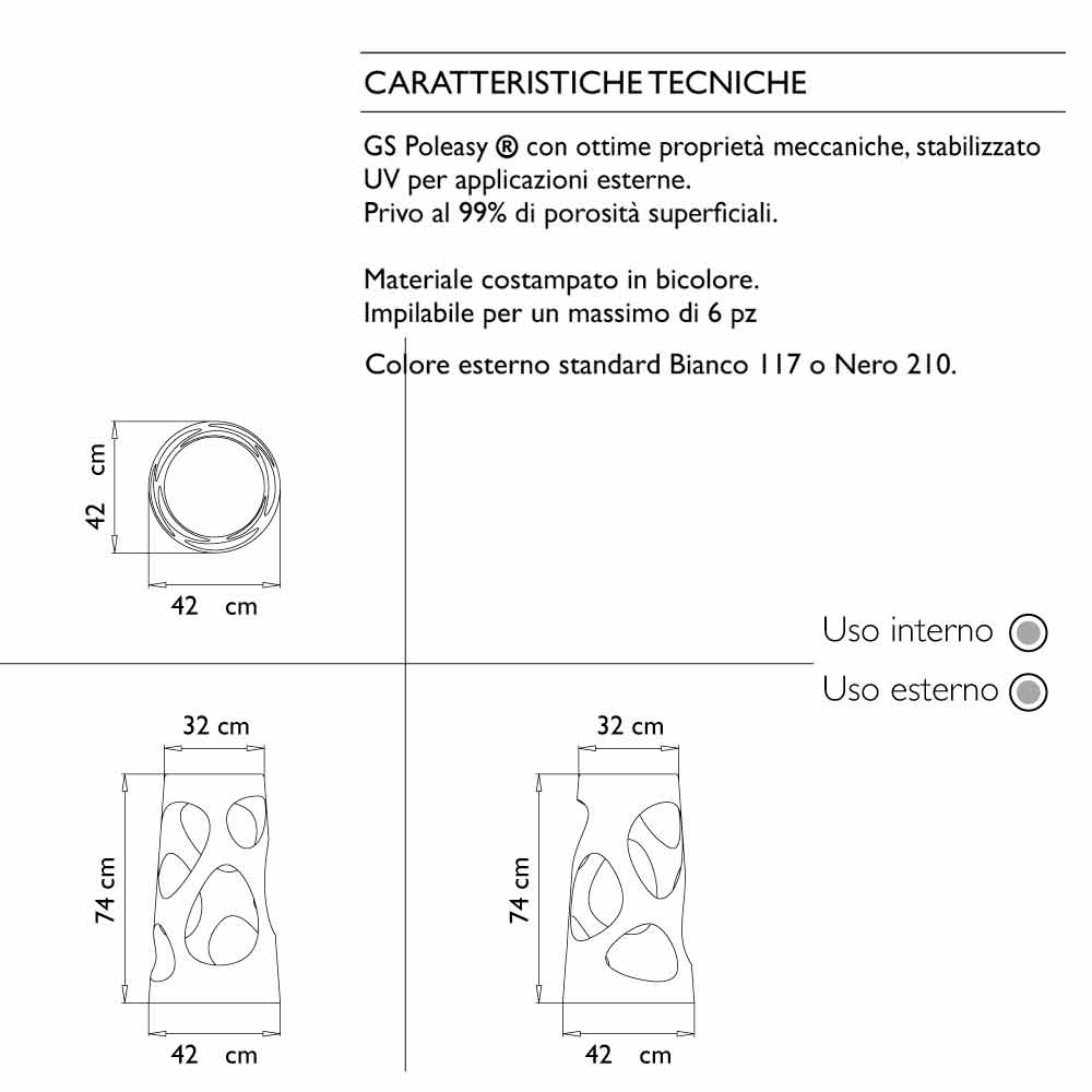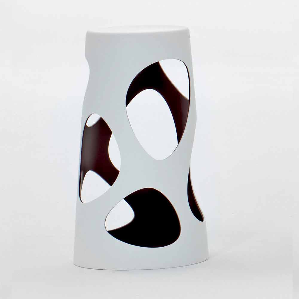 La vivacidad de Liberty proviene del juego abierto de vacíos y sólidos, sobre superficies y volúmenes e inervado por vibraciones cromáticas. Los grandes orificios del tronco hueco realzan, con su asimetría, la energía de la superficie bicolor. Y en el triunfo de la sección cónica, los espacios se agrandan: perfectamente apilables, los taburetes LIbery ocupan y liberan las estancias con un original toque de diseño.