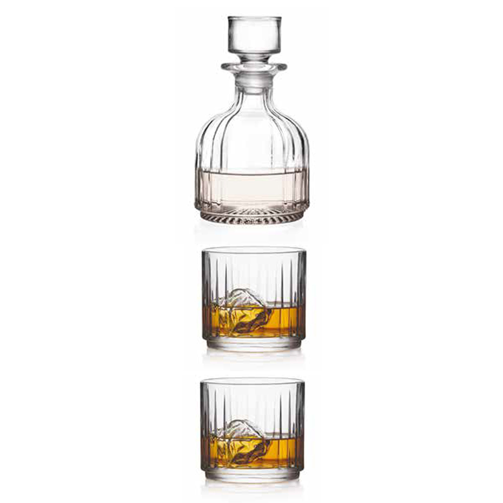 Servicio de botella y vasos apilables para licores en eco cristal, 3 piezas made in Italy.