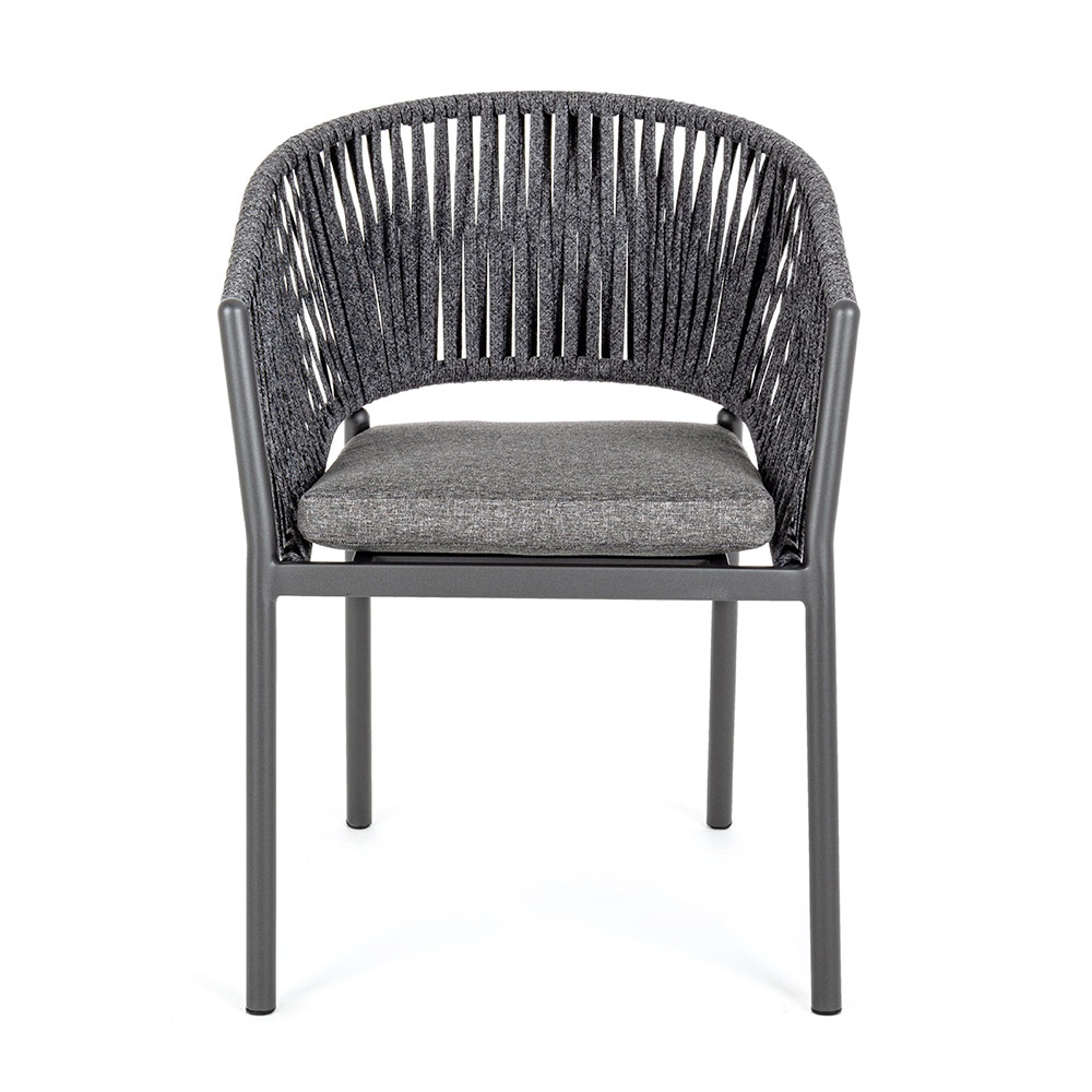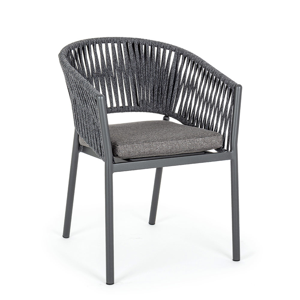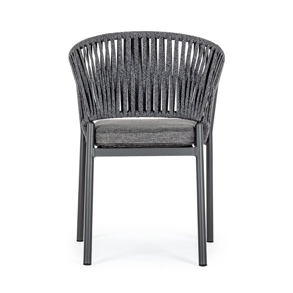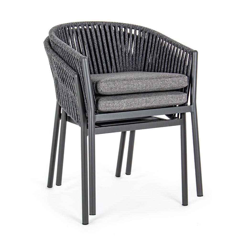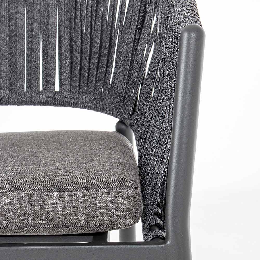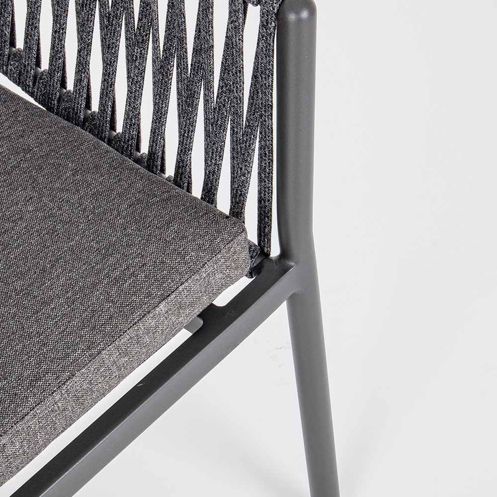 Estructura de aluminio pintado en polvo (poliéster). Tejido con cordones de Tetoron (100% poliéster). Cojín de asiento con funda extraíble con tejido de Olefina (100% polipropileno). Apilable.