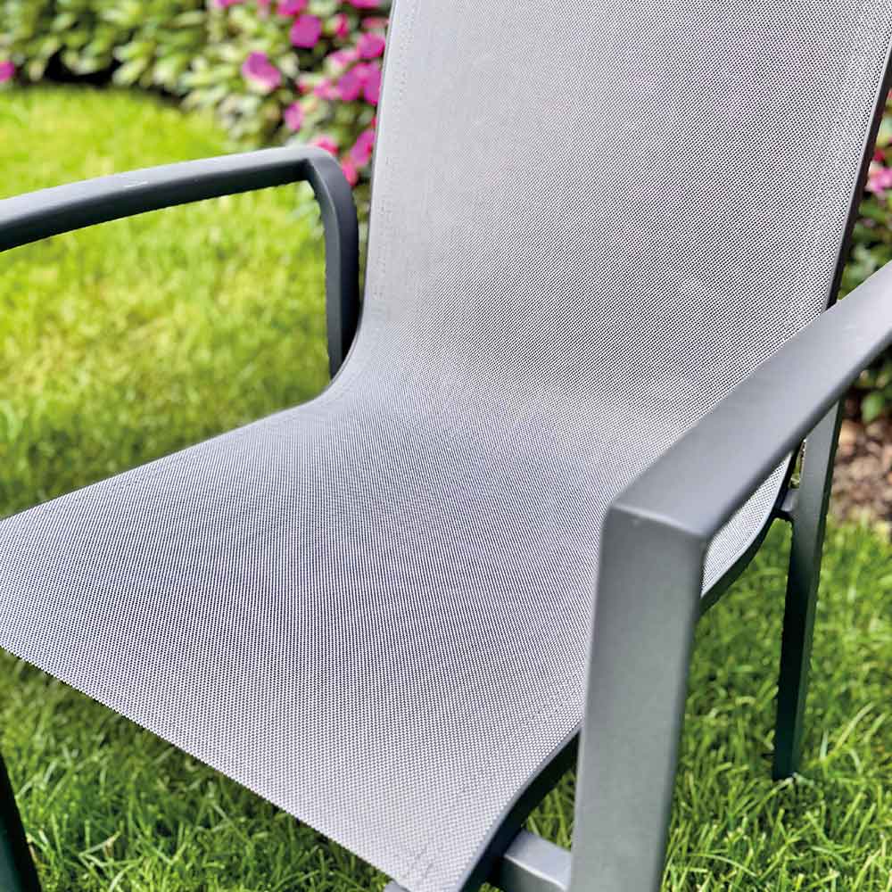 La estructura de aluminio pintado es sólida pero ligera, resistente a la oxidación y a los agentes atmosféricos, perfecta para disfrutar del aire libre sin preocupaciones. El asiento y el respaldo de textilene , un tejido técnico transpirable y flexible, garantizan una comodidad ergonómica incluso después de horas de uso, adaptándose suavemente al cuerpo.