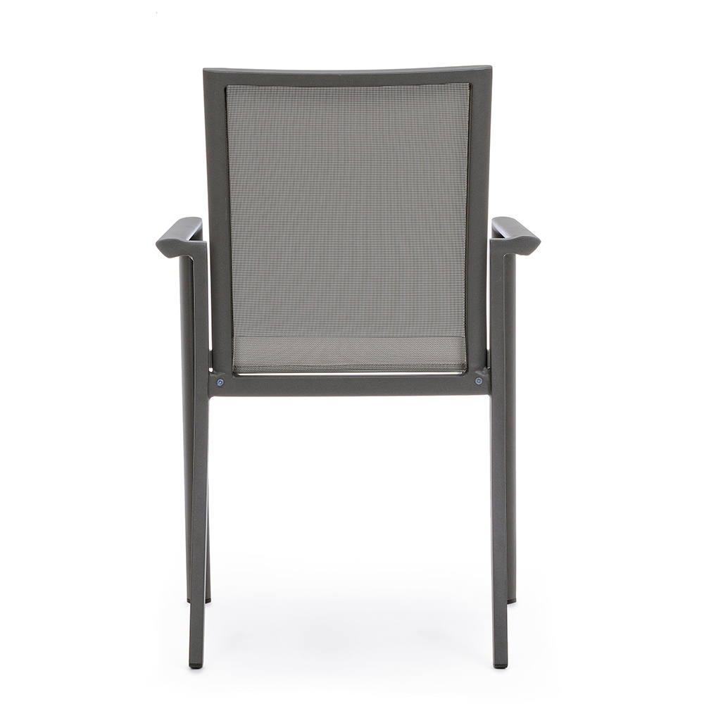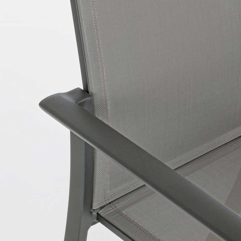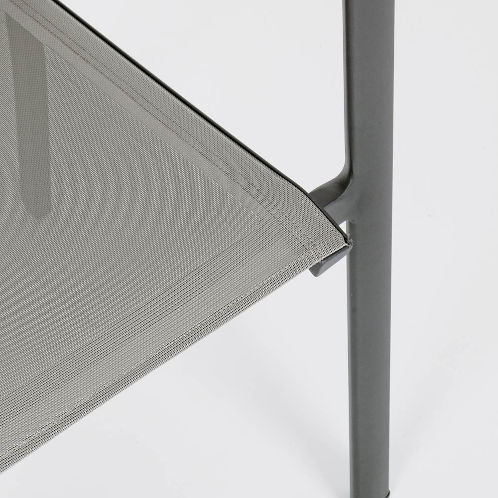 Estructura de aluminio pintado en polvo (poliéster). Asiento y respaldo tapizados en textilene Phifer 1x1. Apilable.