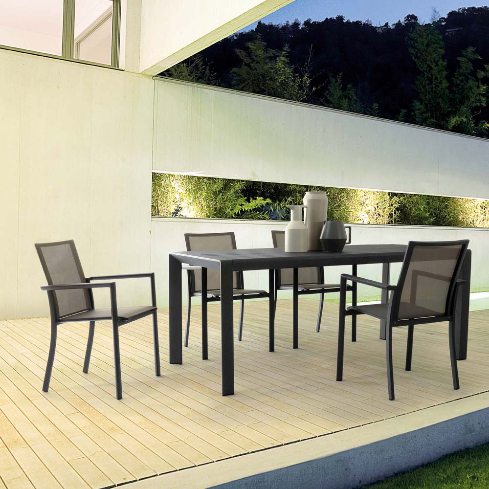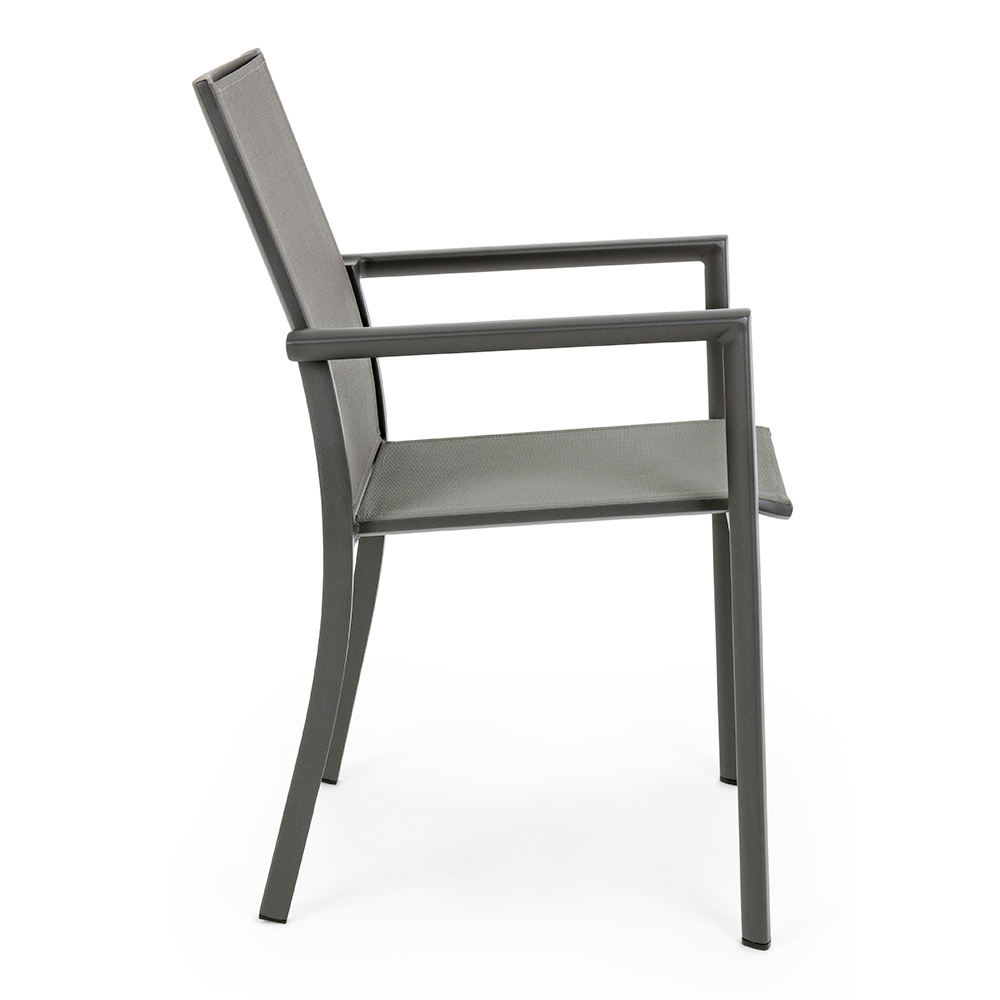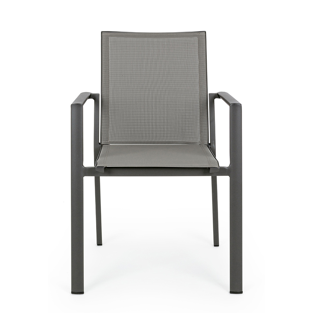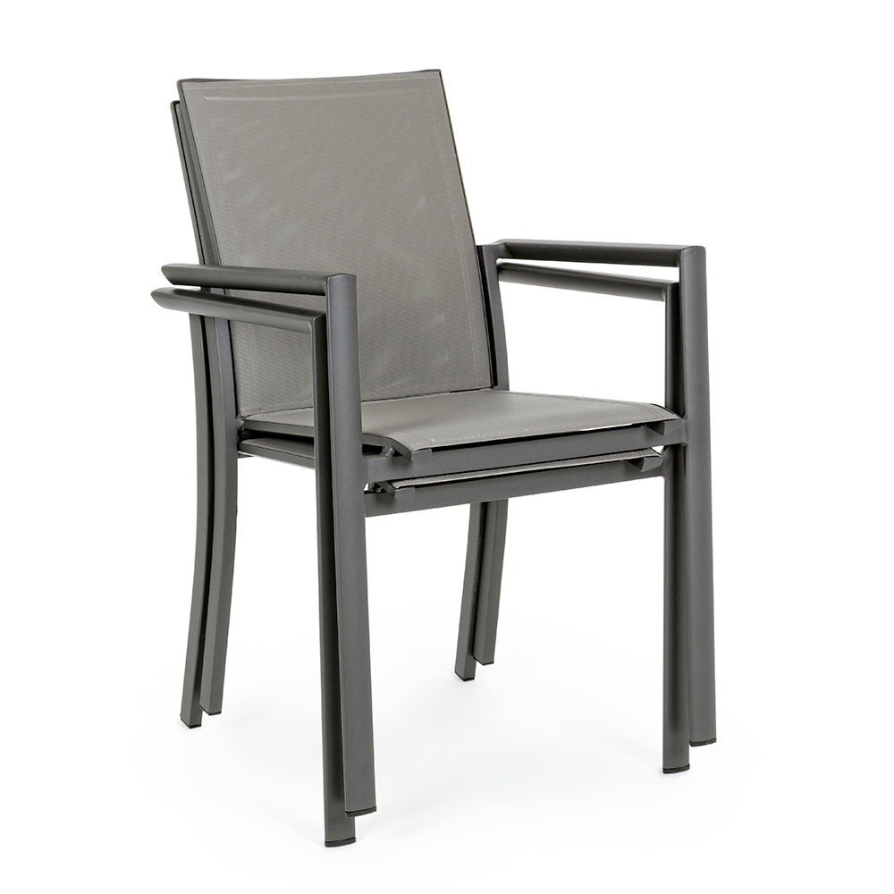 Estructura de aluminio pintado en polvo (poliéster). Asiento y respaldo tapizados en textilene Phifer 1x1. Apilable.