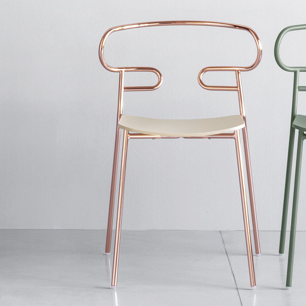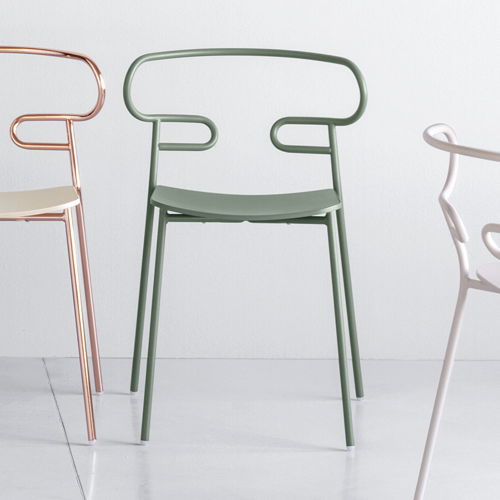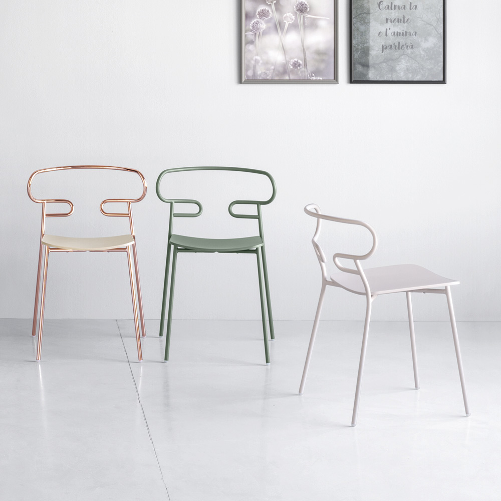 Silla para comedor o cocina en metal pintado con asiento en madera de fresno fabricada en Italia. De la perfecta combinación de elegancia y sencillez nace este objeto de diseño de líneas extremadamente esenciales que da sensación de movimiento y destaca gracias a la peculiaridad del respaldo obtenido gracias a la curvatura de un único tubo metálico. Esta característica aumenta su originalidad , creando así un asiento tan cómodo como estéticamente interesante y único. Además, gracias a la posibilidad de apilarse, estas sillas tienen una funcionalidad aún mayor , permitiendo así optimizar y organizar los espacios de la mejor manera posible.