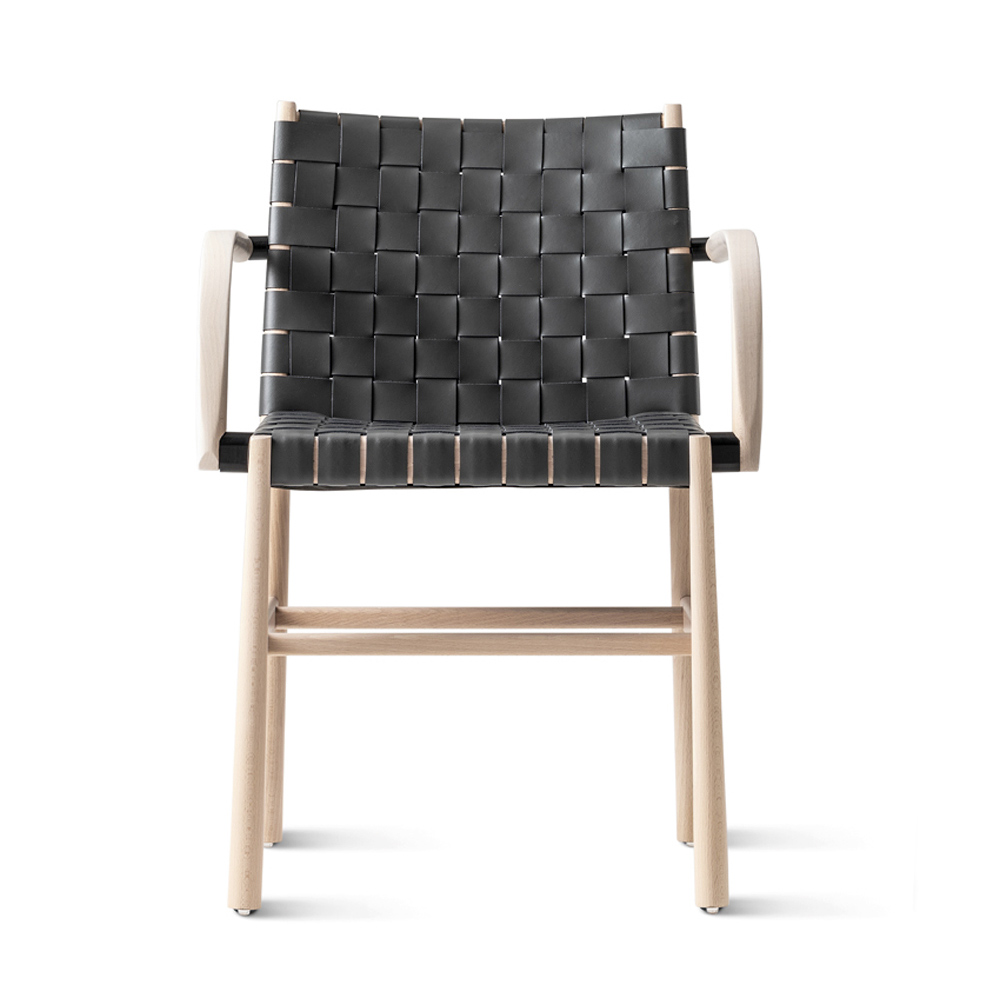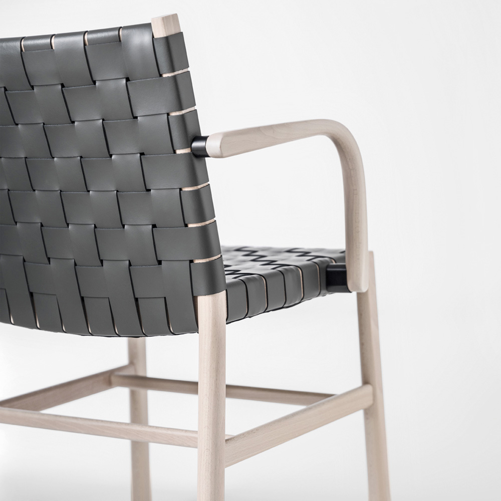 Silla moderna con apoyabrazos fabricada en Italia con estructura en madera de haya blanqueada y respaldo y asiento en cuero trenzado. Tradición y modernidad se encuentran y se fusionan para crear este objeto de diseño innovador con un gusto elegante capaz de caracterizar cualquier ambiente de una manera original y creativa . El particular tejido de cuero que recubre la silla la hace sumamente fascinante , ideal para enriquecer y personalizar con carácter tus espacios. Gracias a la amplia gama de colores disponibles, es posible elegir entre un look sobrio y discreto o una solución más colorida y extravagante, logrando así satisfacer todas las necesidades creando una maravillosa armonía con el mobiliario circundante.
