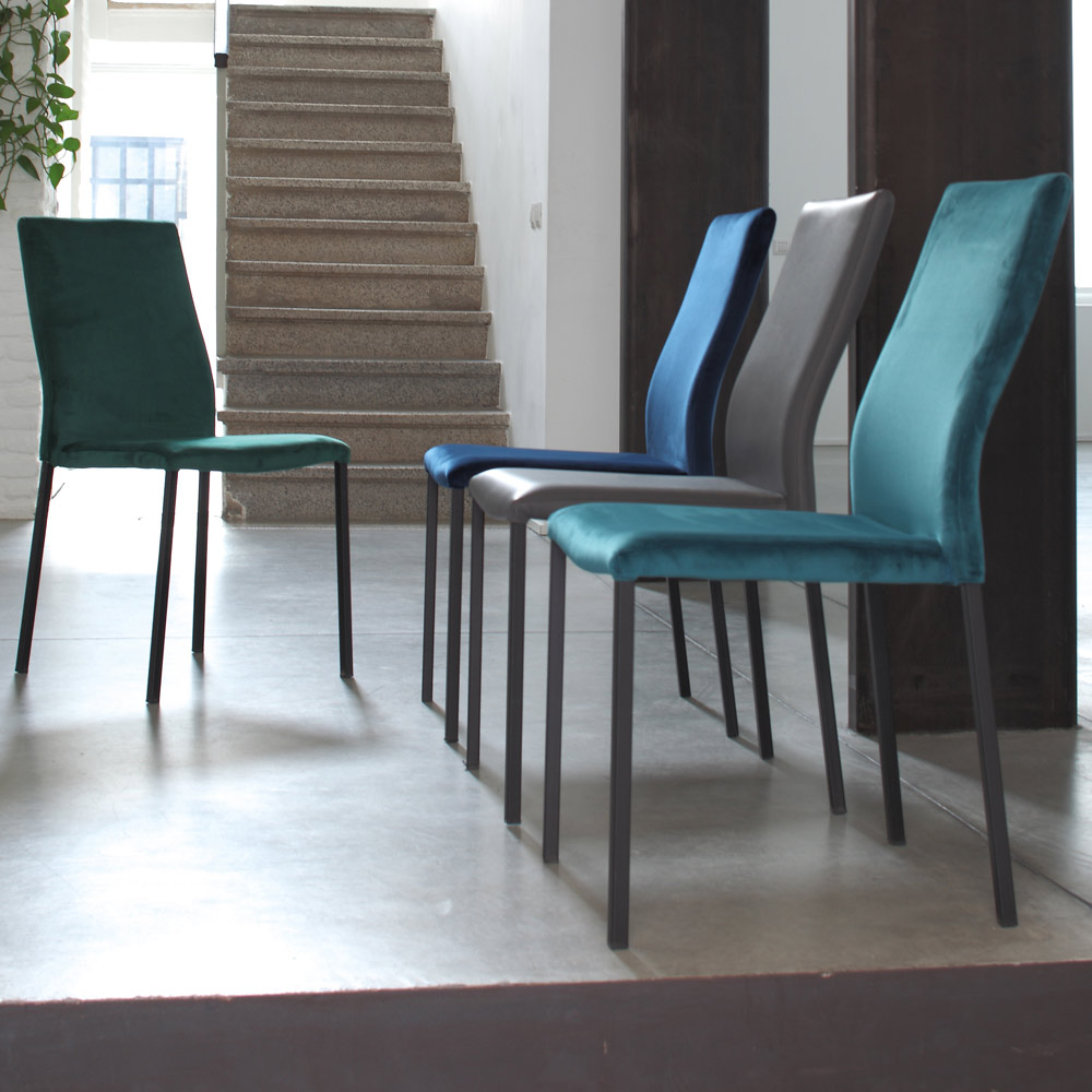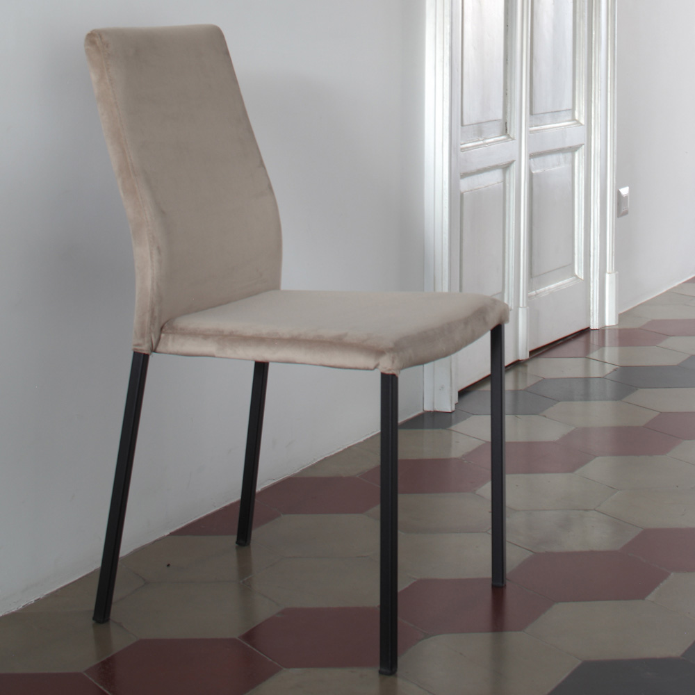 Silla de comedor apilable compuesta por estructura de metal pintado de negro y asiento de terciopelo antimanchas . El resultado de materiales sencillos y de calidad que ayudan a crear un producto perfecto para cualquier entorno. Caracterizada por un diseño esbelto y elegante, esta silla tiene líneas simples y sinuosas, un estilo limpio y delicado que combina sencillez y elegancia.