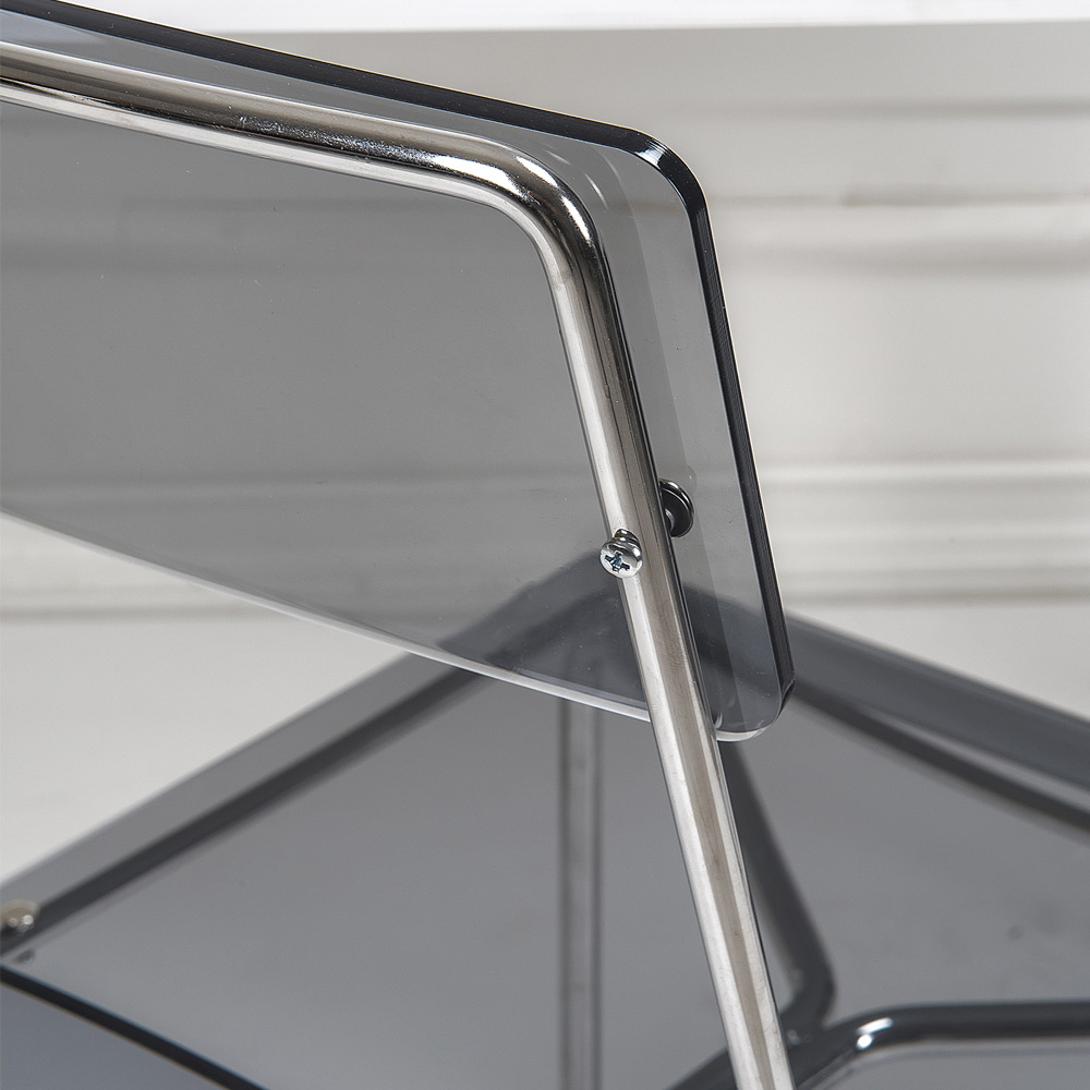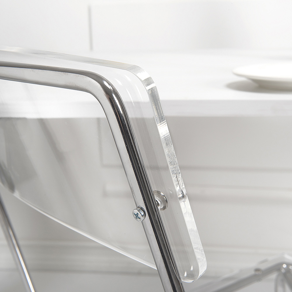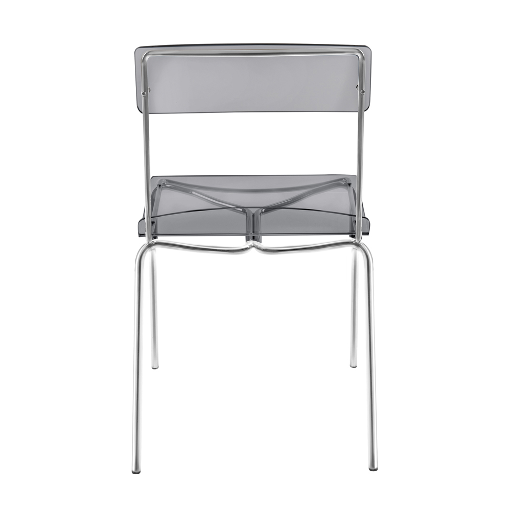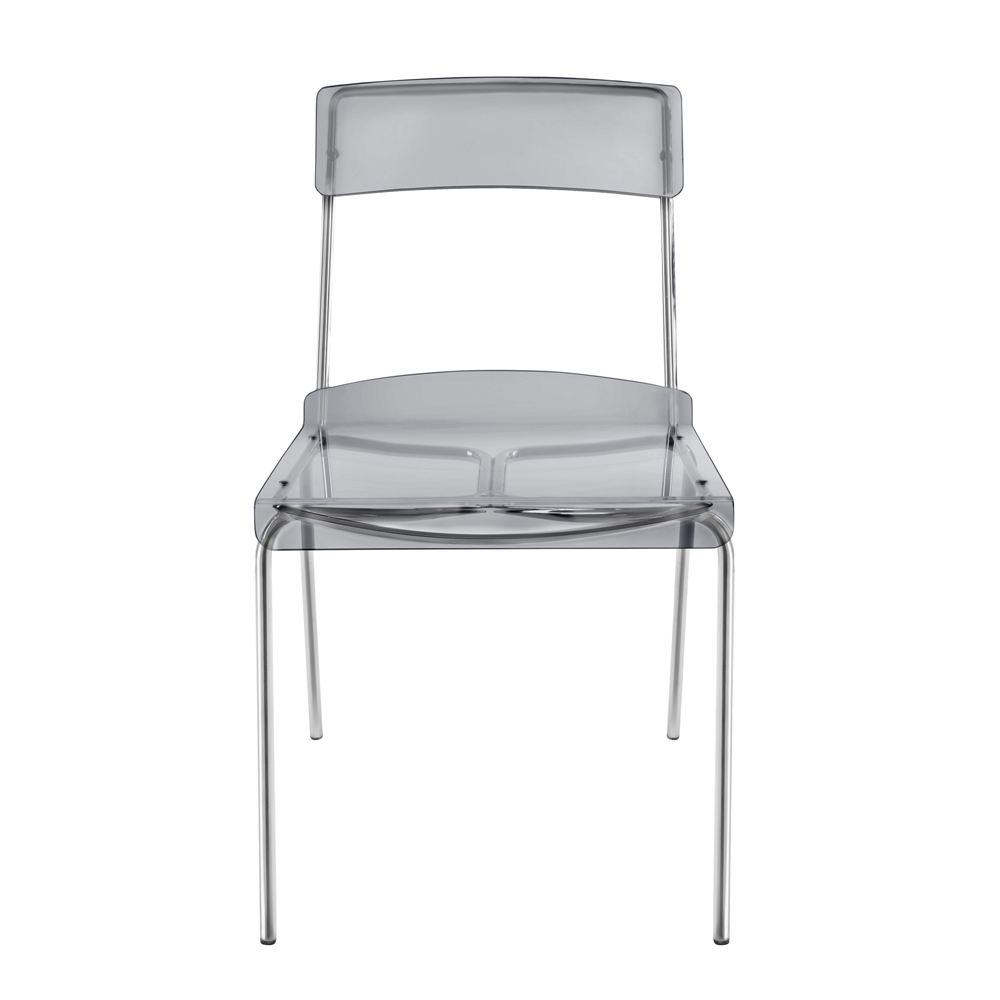 Silla de comedor con carcasa de plexiglás y estructura de metal cromado plata , íntegramente fabricada en Italia . Una solución de decoración ideal para aquellos que buscan sencillez y versatilidad de uso para poder amueblar sus espacios domésticos con un carácter moderno y alta funcionalidad . La forma de la estructura también permite apilarlos, por lo que es una idea perfecta también para espacios contract como bares y restaurantes.