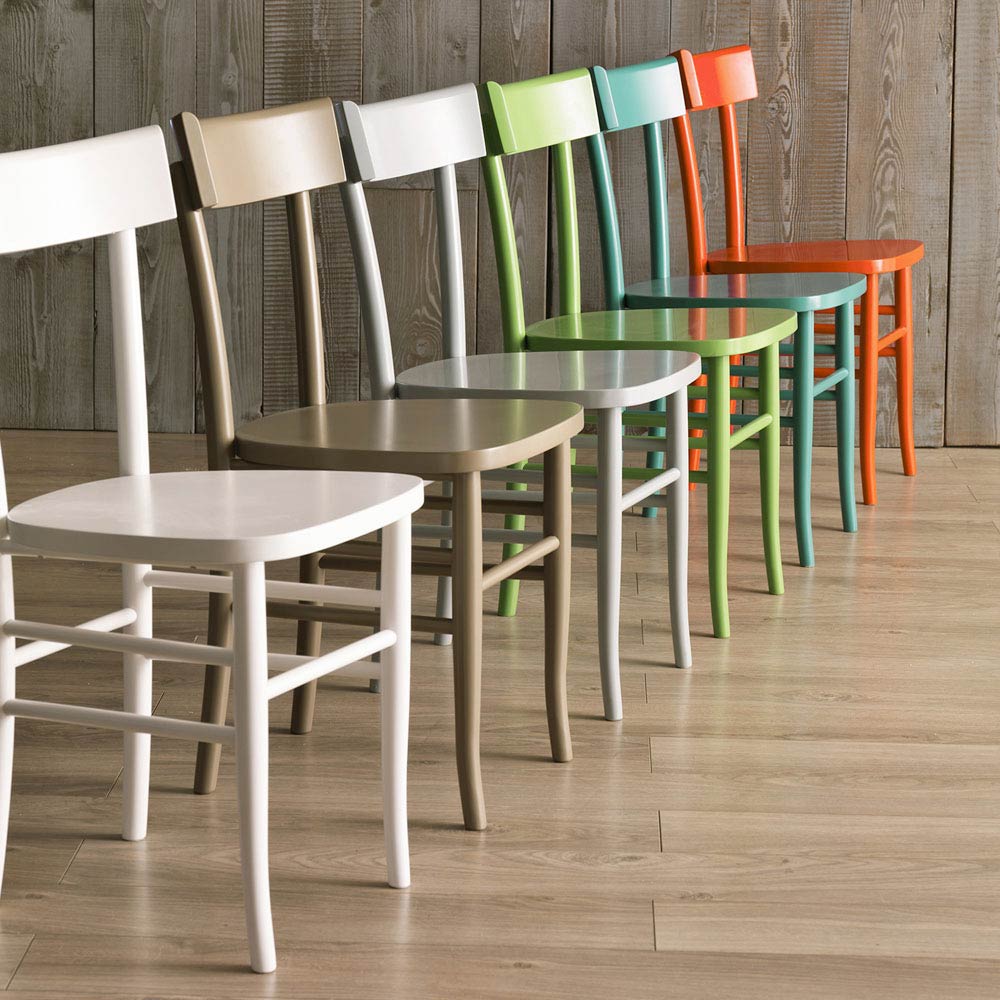 Silla en madera de haya lacada, disponible en diferentes variantes de color. Selecciona el acabado que desees en el menú desplegable.