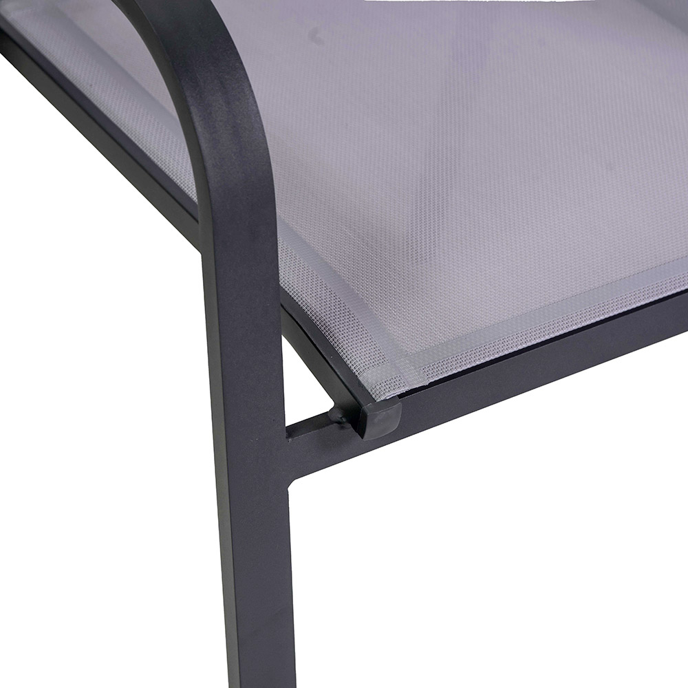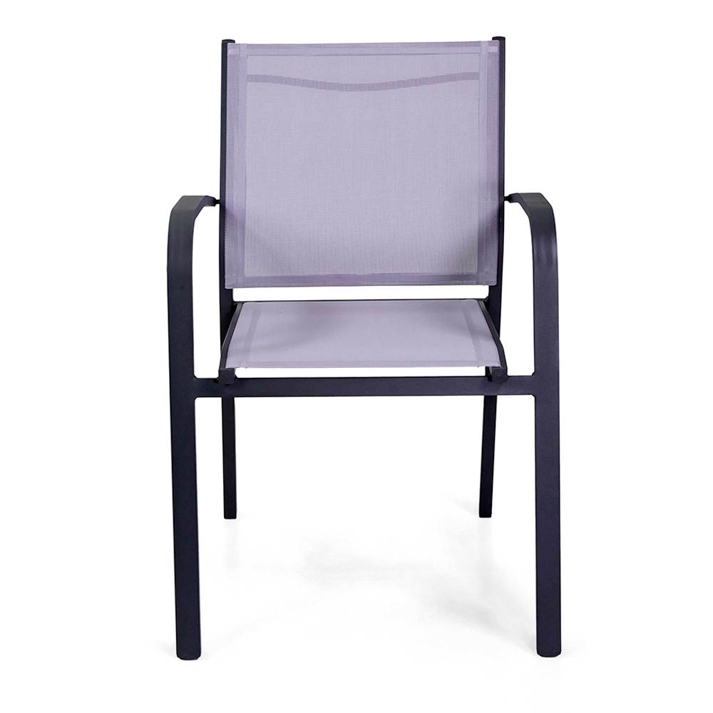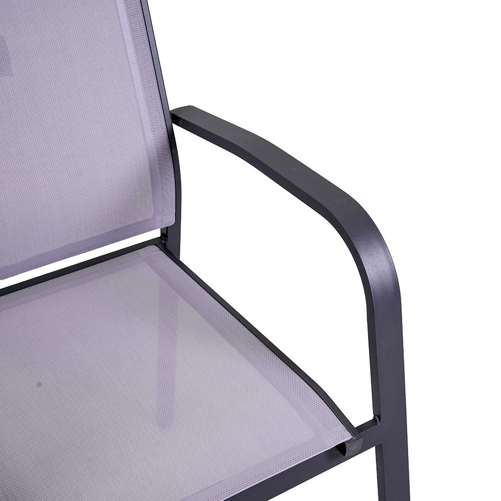 Esta silla con estructura de aluminio con recubrimiento en polvo antracita representa el equilibrio ideal entre funcionalidad y estilo, perfecta para entornos de exterior como jardines y terrazas. El textileno gris no sólo le da un aspecto moderno y elegante, sino que también asegura un asiento cómodo y resistente a la intemperie.