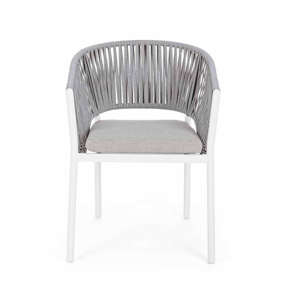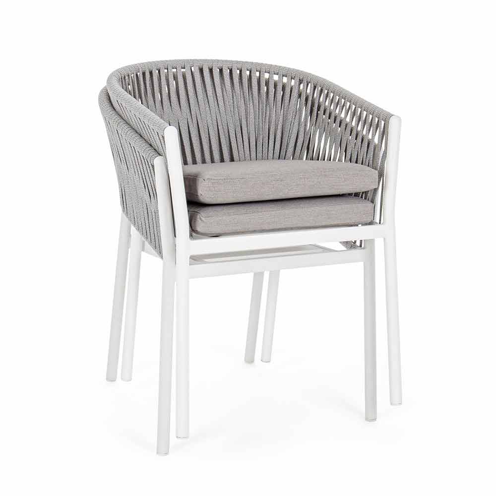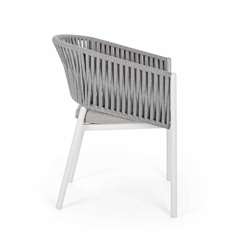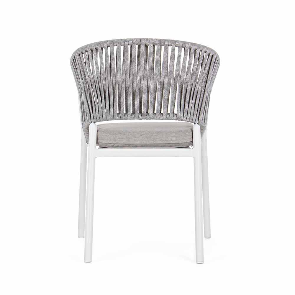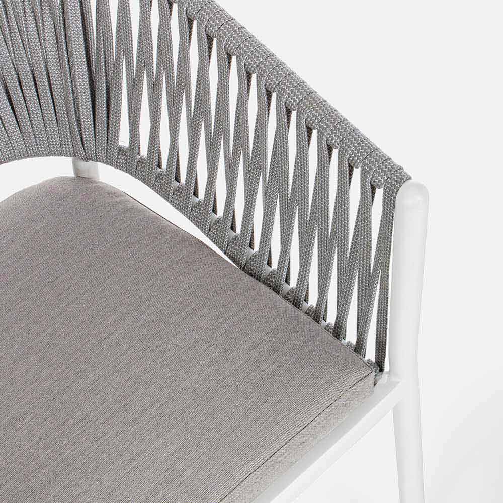 Silla de exterior moderna de aluminio blanco con tejido de cuerda y cojín, diseño, apilable.