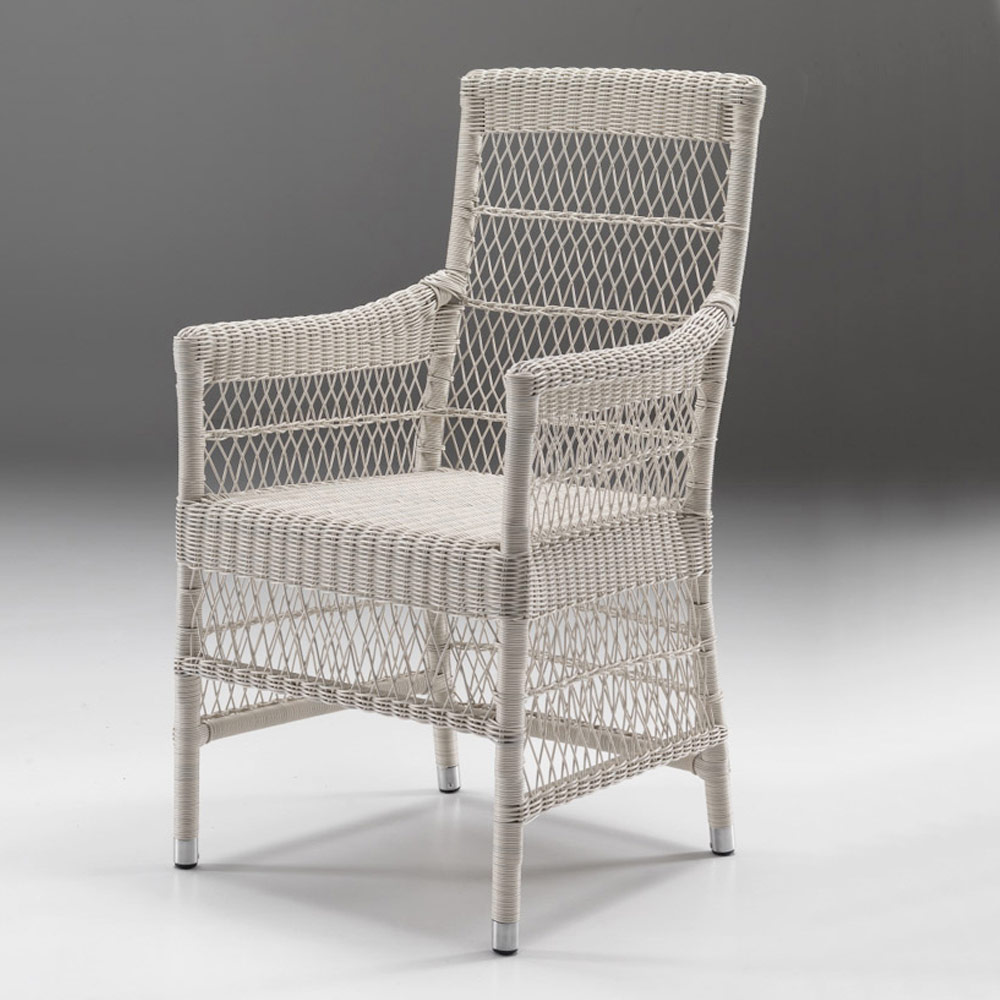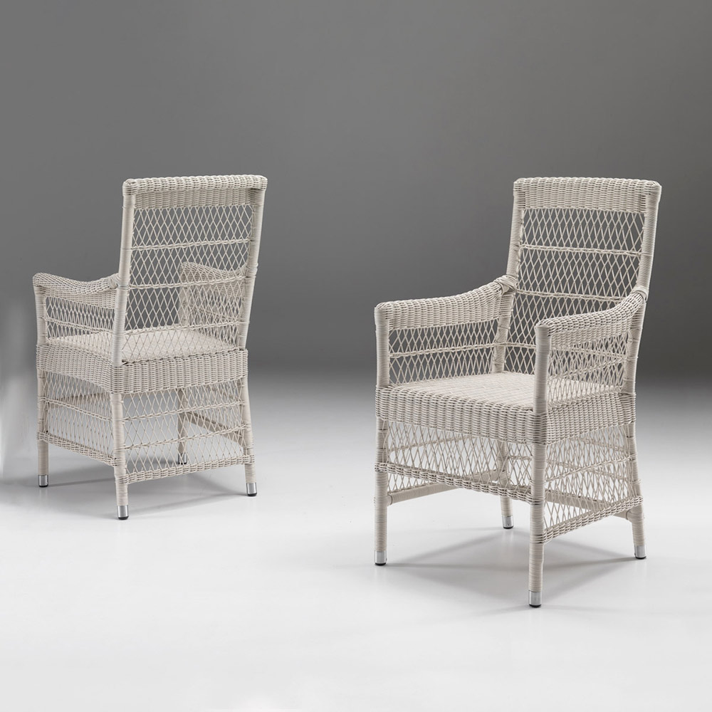 La silla de exterior con reposabrazos Gigi tiene una estructura con un marco de aluminio con recubrimiento en polvo, sobre el que se teje a mano fibra de poliratán de 3 mm de grosor de la más alta calidad.
