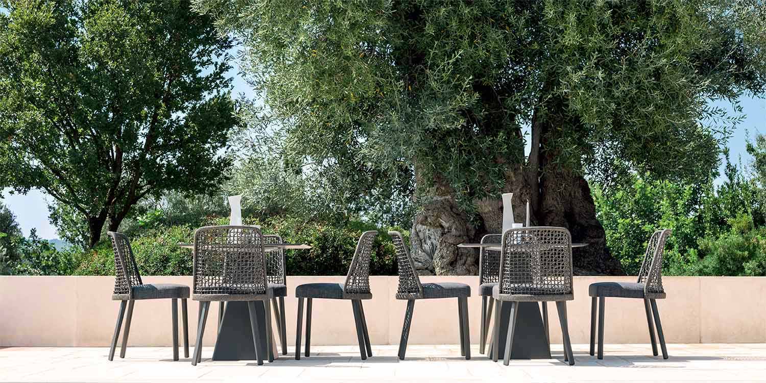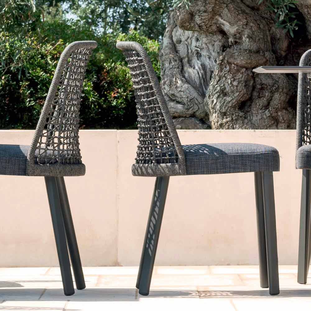 Emma es una silla de jardín caracterizada por una estructura de fibra sintética tejida a mano con un marco de aluminio con recubrimiento de polvo gris oscuro .