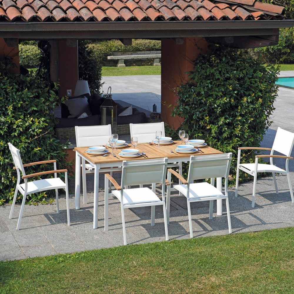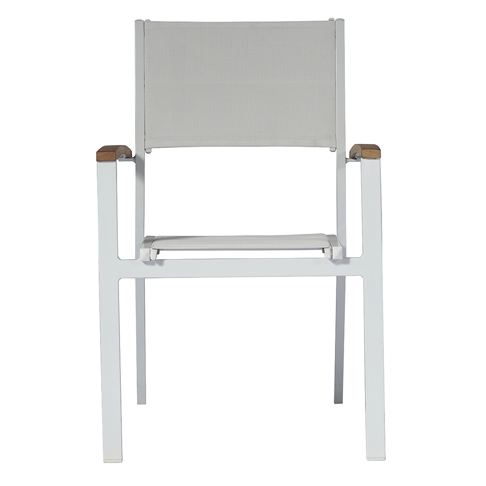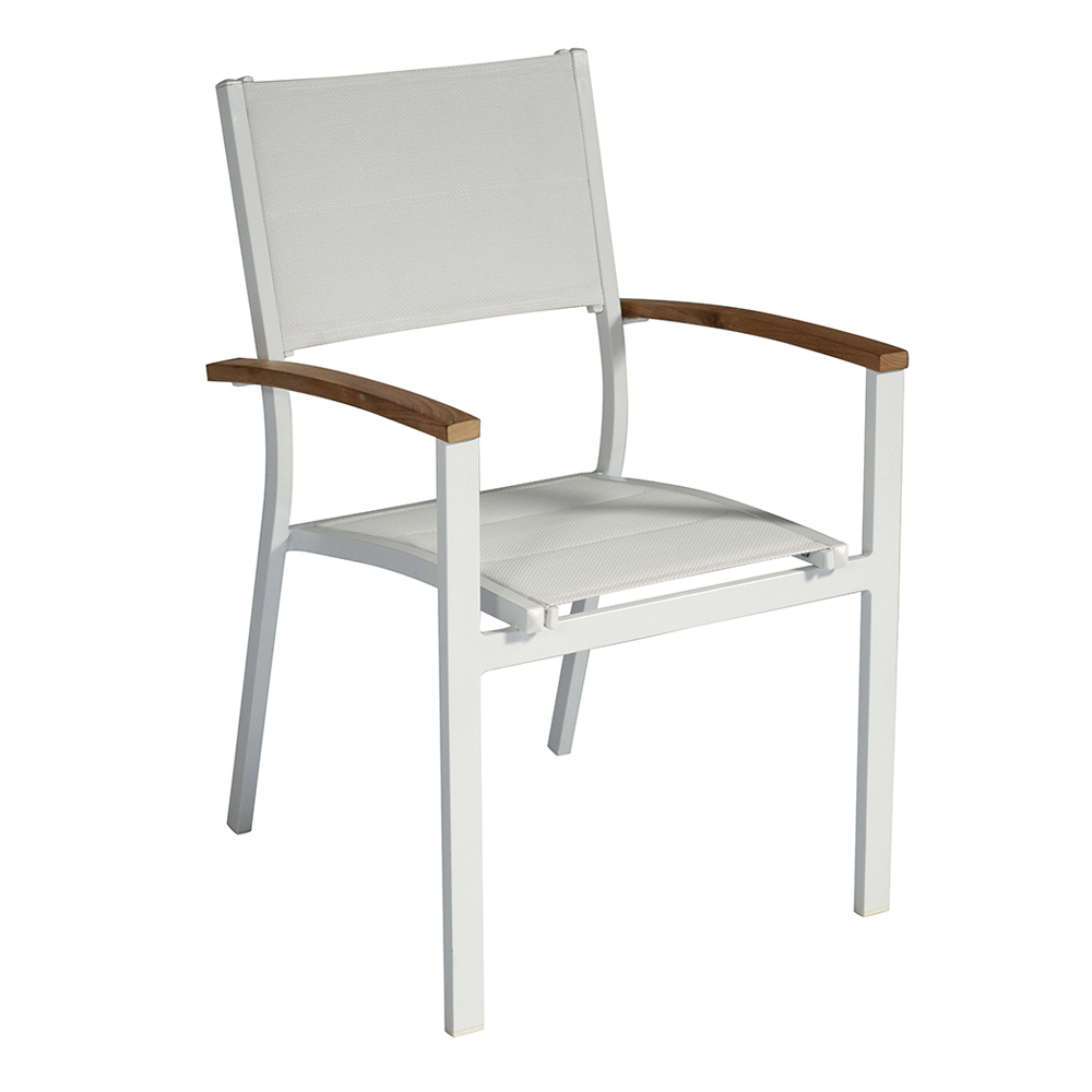 Silla apilable para exteriores con estructura de aluminio y asiento de textileno acolchado marfil enriquecido con elegantes apoyabrazos de teca . Esta silla de exterior aúna diseño y sencillez , fruto de materiales sencillos pero resistentes que dan vida a un producto con un diseño original y vanguardista, perfecto para completar cualquier ambiente.