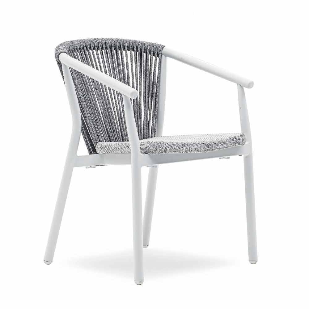 Silla de jardín apilable de diseño moderno con base y asiento de aluminio en tejido técnico blanco o ceniza.
