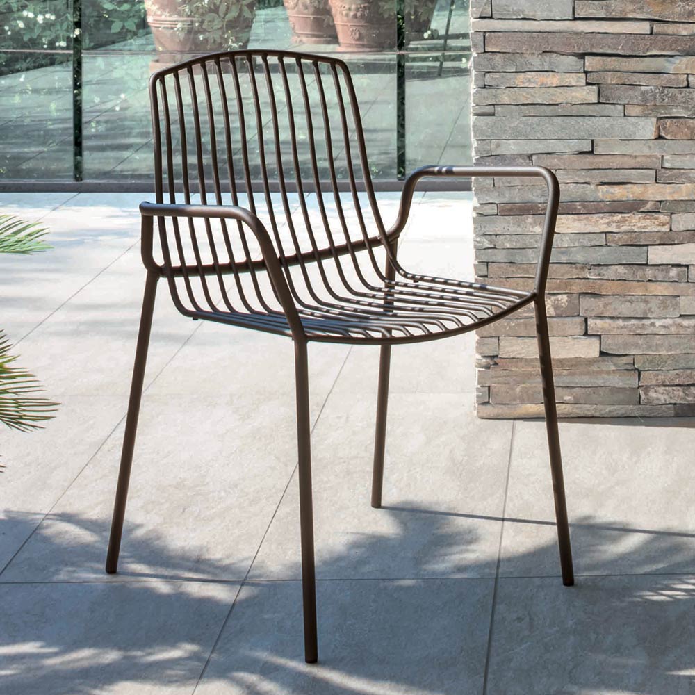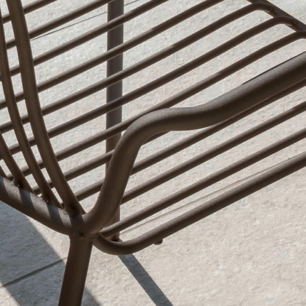 Silla de exterior fabricada íntegramente en Italia en metal pintado gofrado . Su estética esencial se caracteriza por la particular trama de alambre que sigue las formas ergonómicas de la estructura de forma armoniosa y sinuosa, adaptándose mejor a la silueta del cuerpo para ofrecer un asiento confortable potenciado en la versión con reposabrazos que permite mantener una postura correcta y cómoda . Un mueble que proviene de un proceso de producción artesanal 100% Made in Italy mediante el uso de materias primas de alta calidad que ofrecen un resultado sólido y resistente .