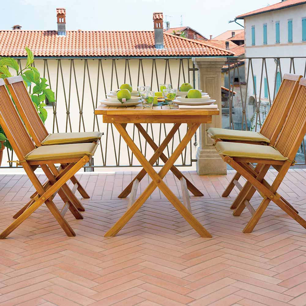 La teca está clasificada como la madera más valiosa disponible para muebles de exterior. Es extremadamente duradero, estable, resistente a los agentes atmosféricos, hongos, ataques de parásitos e insectos. Contiene altos niveles de aceites naturales que lo hacen resistente y limitan la absorción de humedad. Con el tiempo, los muebles de teca expuestos al sol, la lluvia, la humedad, etc. generalmente tienden a adquirir un color gris plateado: esto se debe a un proceso de oxidación superficial que protege naturalmente la madera. Este proceso es puramente estético y no daña la estructura ni la calidad de la madera. La aparición de aceite en la superficie de los muebles de teca es un proceso natural: el aceite puede filtrarse durante los primeros meses, de forma más o menos constante dependiendo del entorno en el que se coloquen los muebles. Los aceites naturales que se encuentran en la teca son los que la convierten en la mejor madera para muebles de exterior.