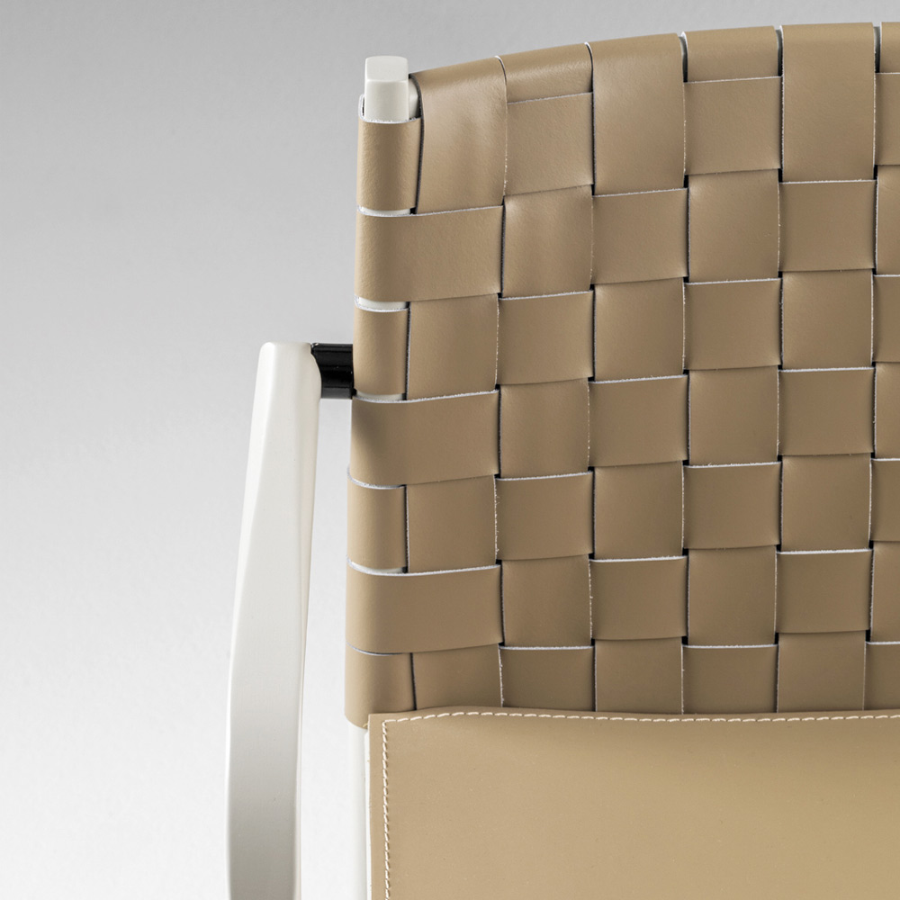 Silla moderna con reposabrazos fabricada en Italia con estructura de madera de haya lacada en beige y respaldo y asiento de cuero. Un diseño que se inspira en los estilos tradicionales revisitados en clave contemporánea para crear un complemento que concilia un lado funcional y un lado puramente decorativo capaz de caracterizar y hacer único el mobiliario de cualquier ambiente moderno. Lo que enriquece la estética es la peculiaridad del respaldo en piel trenzada que aumenta la originalidad del producto y que, gracias a la gama de colores disponibles, responde a cada necesidad de estilo, logrando crear una armonía única entre todos los complementos. regalo.
