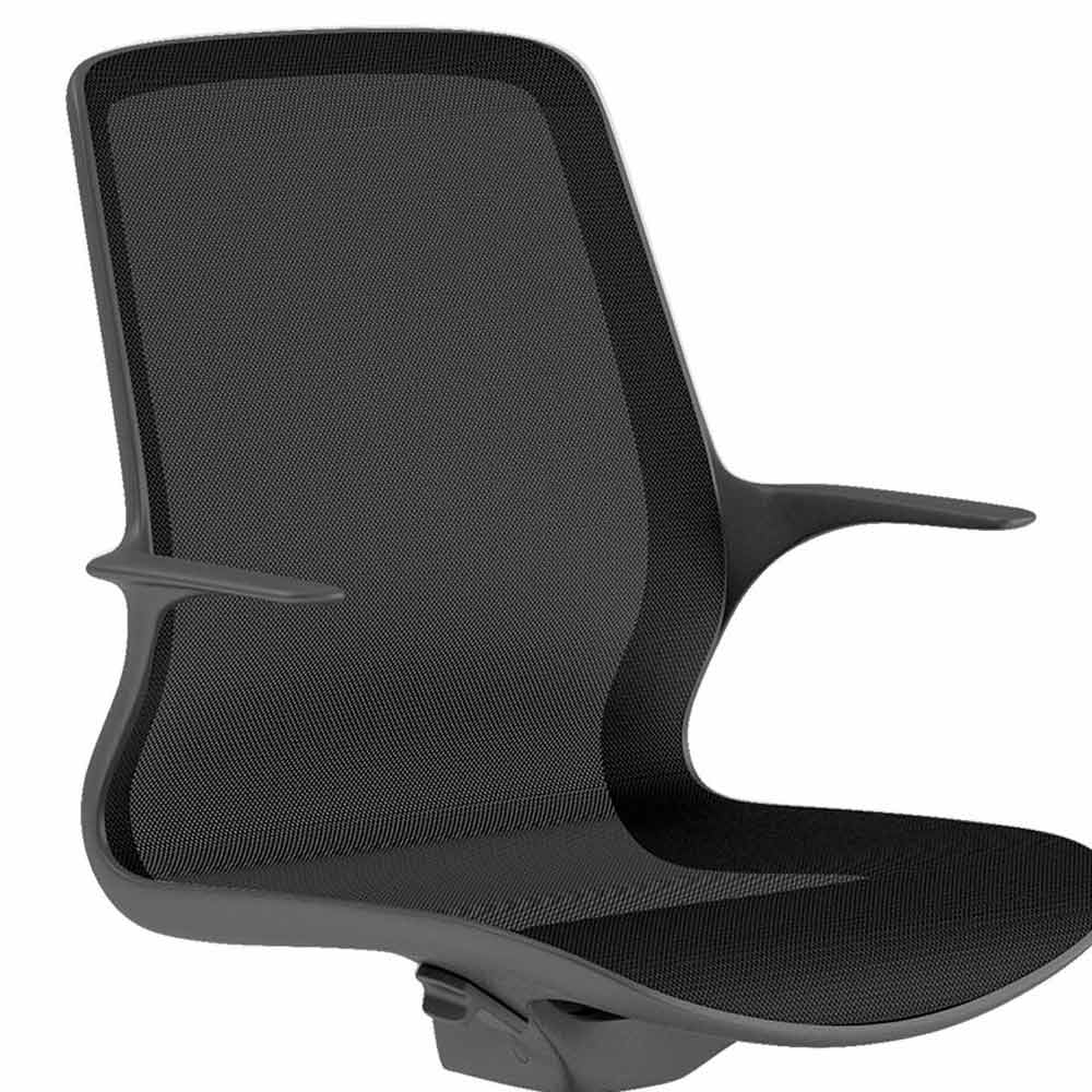 Silla giratoria de oficina con reposabrazos fijos cubiertos de malla negra, estructura de nylon negro.