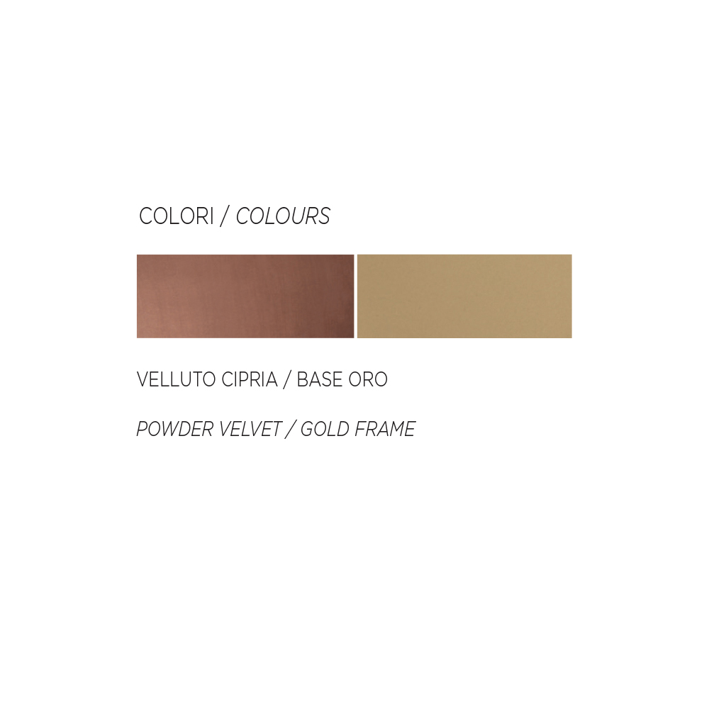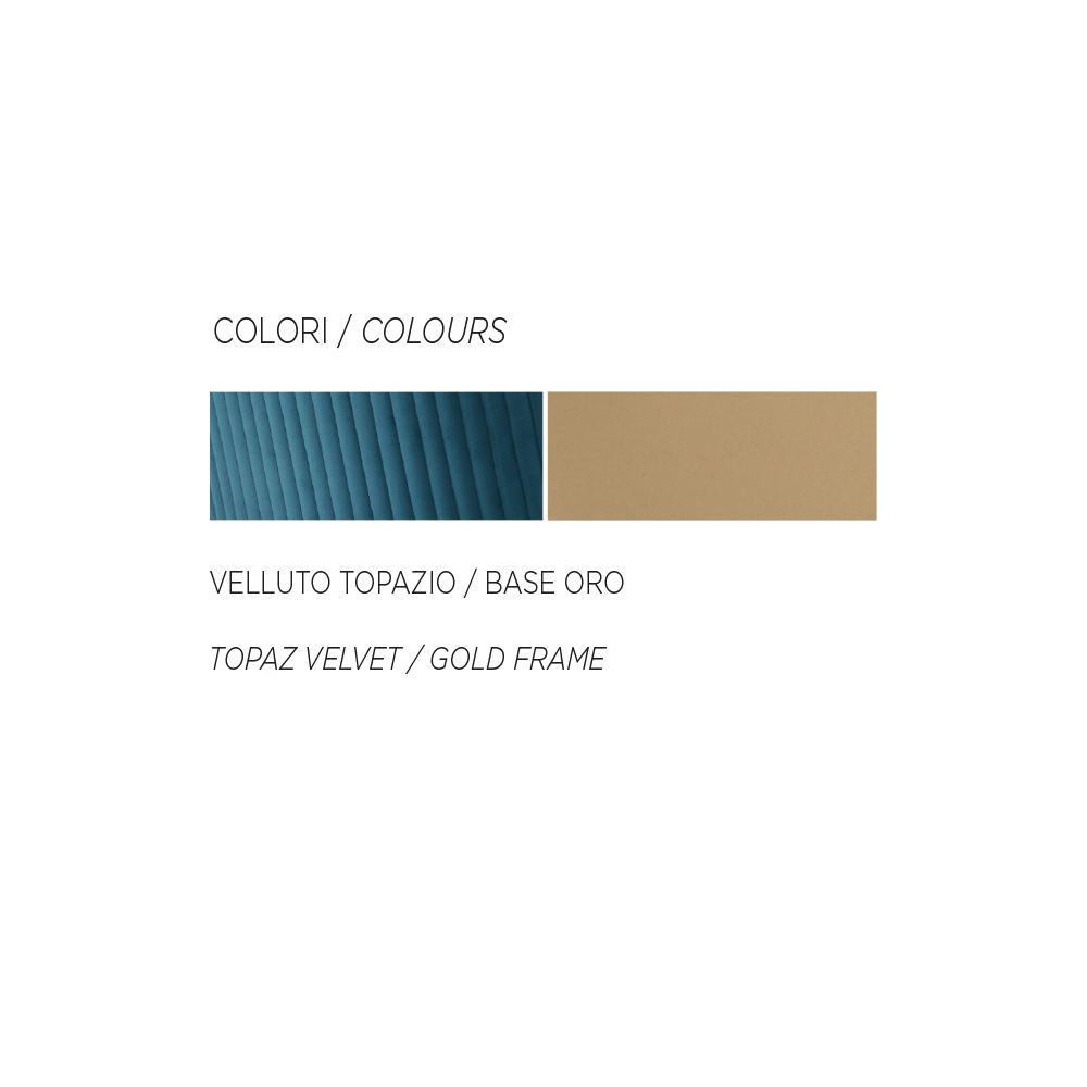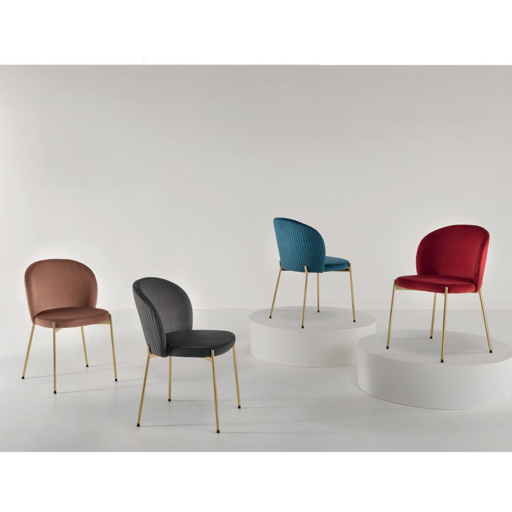 Silla de salón con asiento acolchado tapizado en terciopelo y estructura de metal dorado . Un mueble con un estilo esencial reinterpretado en clave contemporánea para dar vida a un original asiento a través de la combinación de materiales y colores modernos e innovadores . El resultado es una solución de decoración única que aúna funcionalidad y versatilidad para amueblar con personalidad los espacios de tu hogar.
