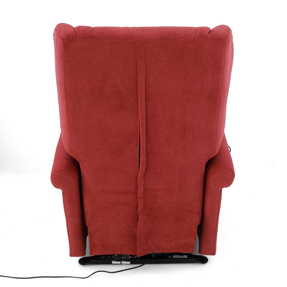 Sillón elevador con sistema de rodillos integrado , estructura de metal y madera , y acolchado de espuma de poliuretano indeformable de diferentes densidades, acabado Burdeos Lux. Incluye dos motores y un mando a distancia para un control cómodo de todos los movimientos disponibles.
