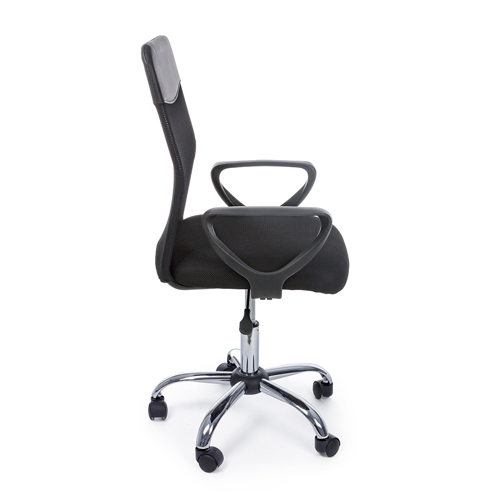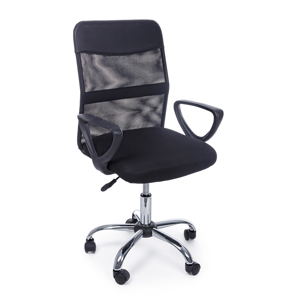Sillón de oficina giratorio en acero y tejido de malla negra con reposabrazos.