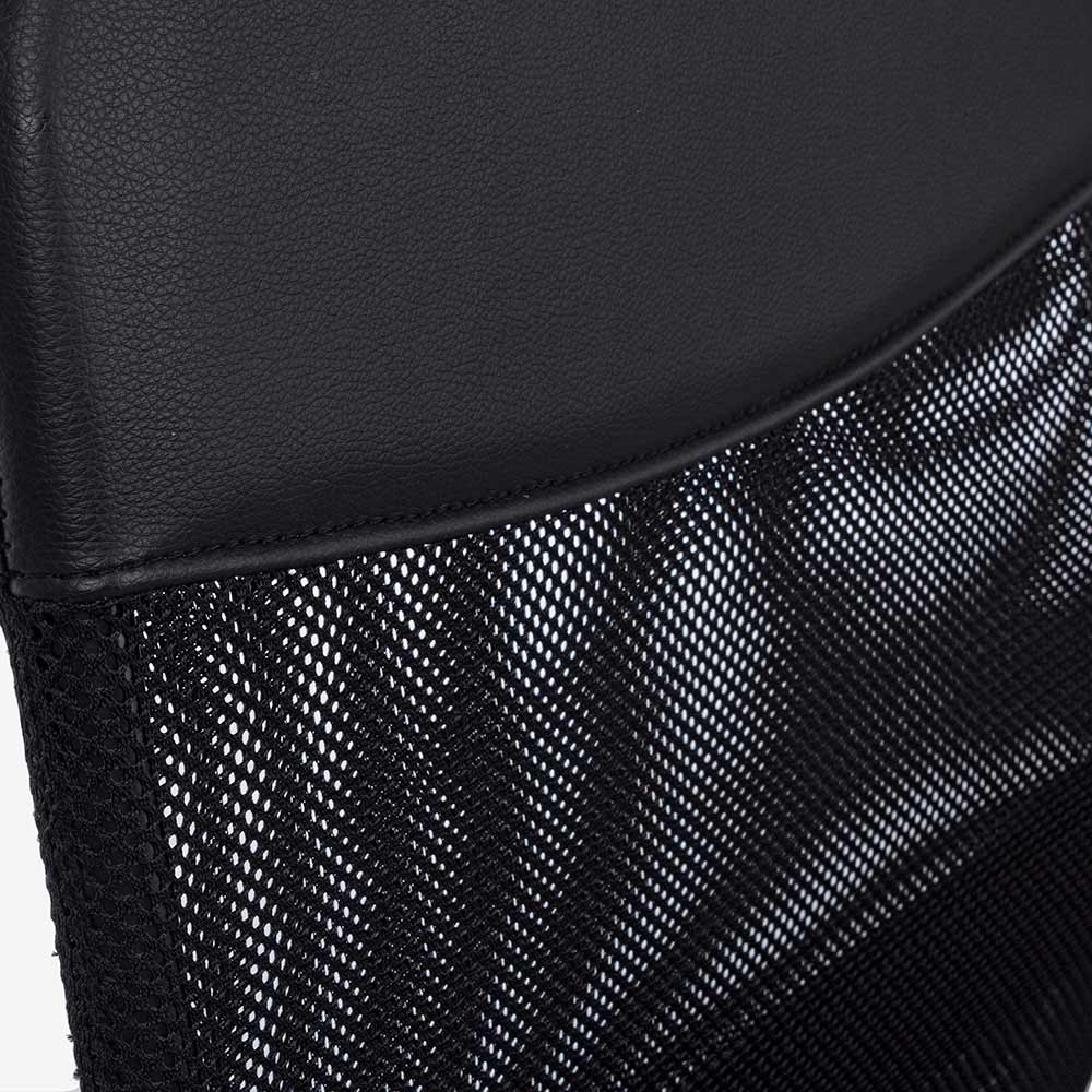 El asiento regulable en altura está acolchado y tapizado en tejido 100% poliéster mientras que el respaldo está tapizado en tejido de malla 100% poliéster con inserto de símil piel.