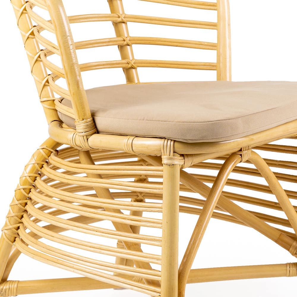 Silla de exterior fabricada en ratán natural tejido y equipada con un cojín de asiento con tapizado en el estándar "Beige Piedra" .