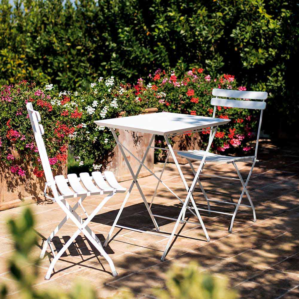 hierro galvanizado con recubrimiento en polvo, pintado con polvos termoendurecibles que le otorgan resistencia y solidez. Esto, junto con su diseño minimalista y líneas ligeras, la hace práctica y ligera. Gracias a su amplia gama de colores y a su posibilidad de plegarse para optimizar el espacio, esta silla se adapta perfectamente a cualquier espacio exterior, desde espacios privados como jardines y terrazas hasta bares y restaurantes.