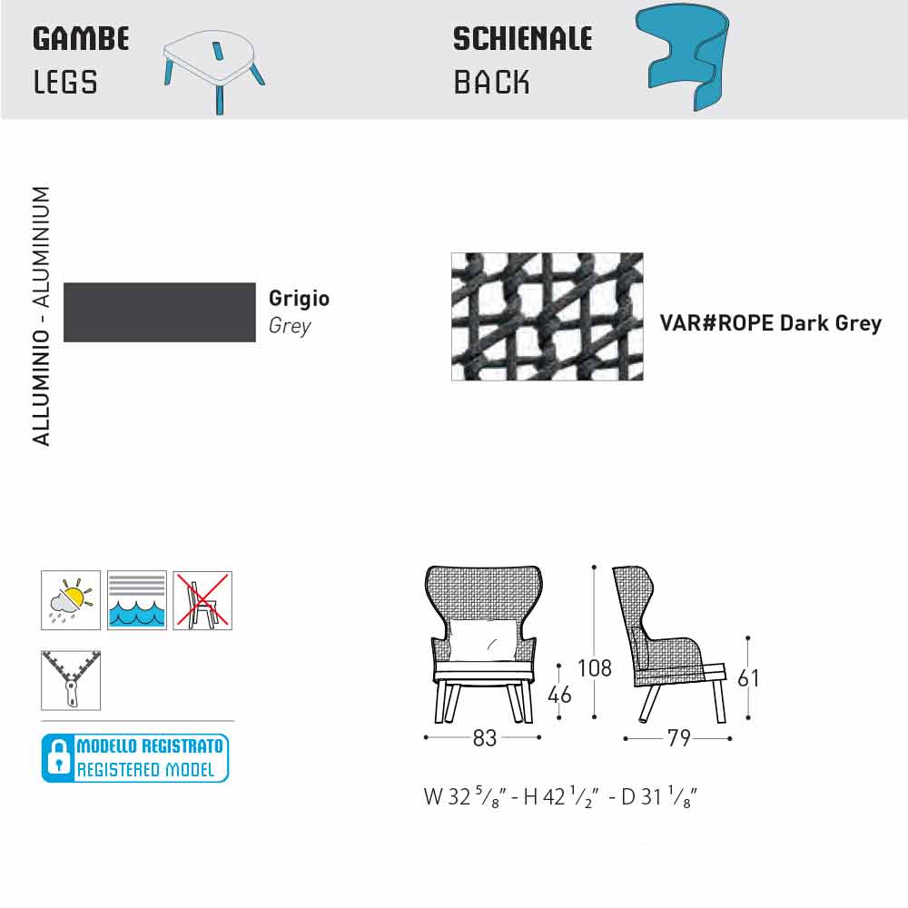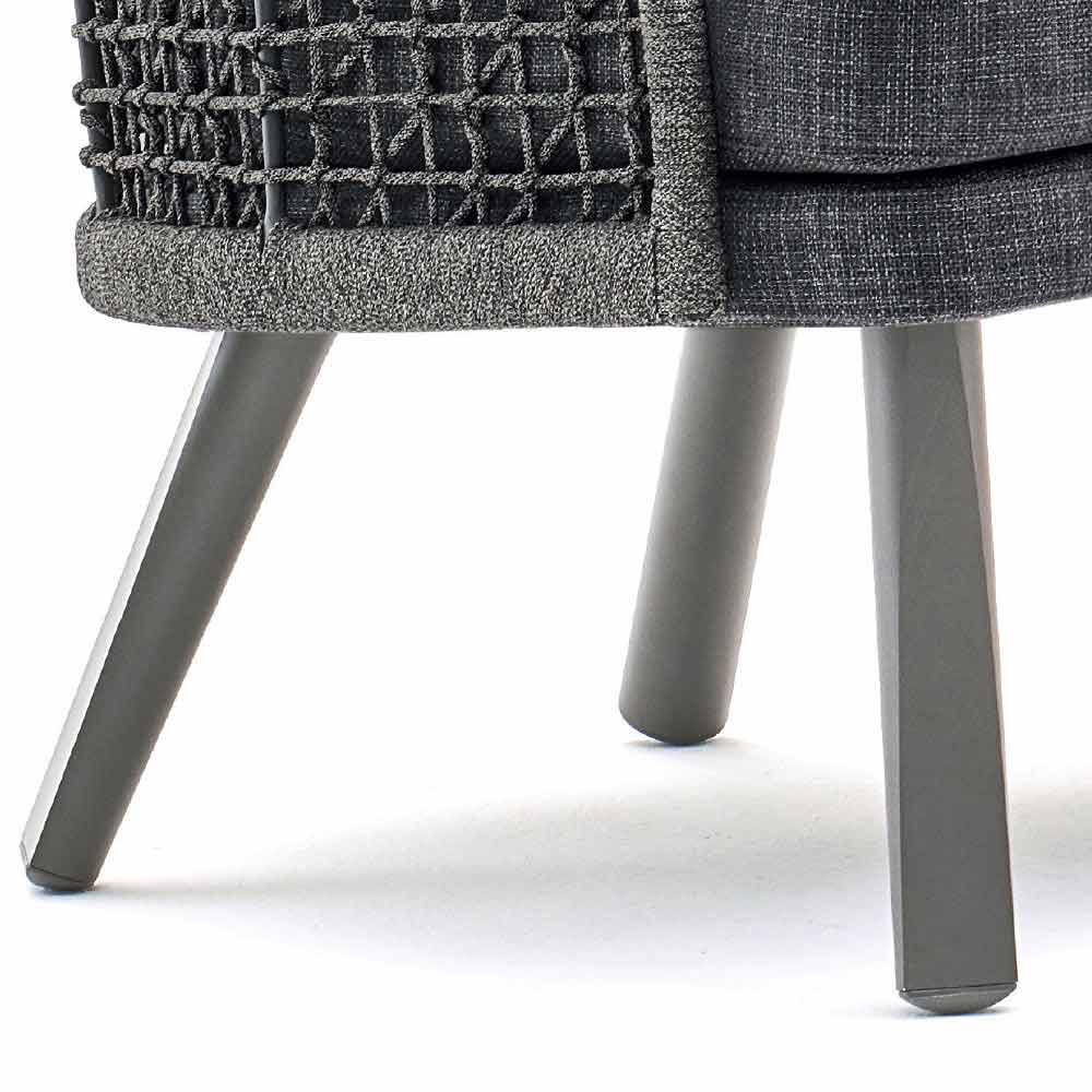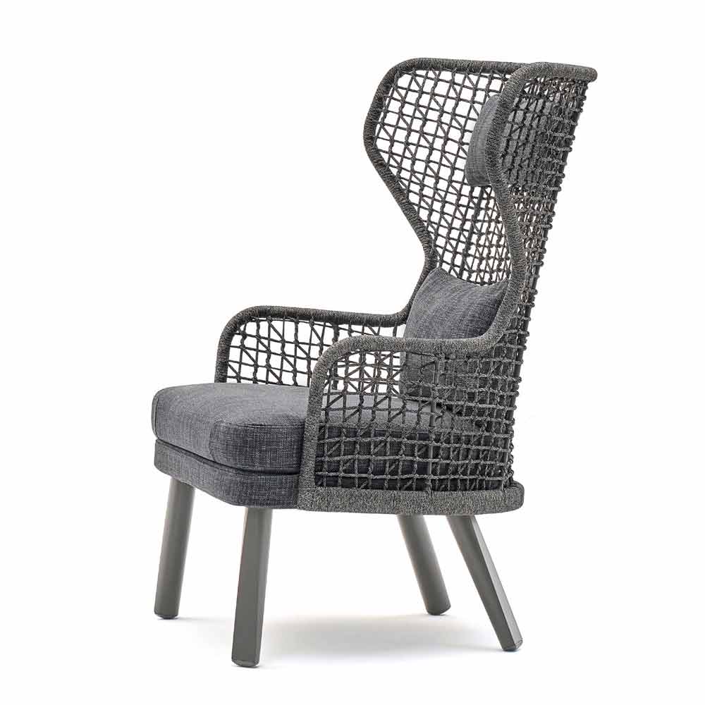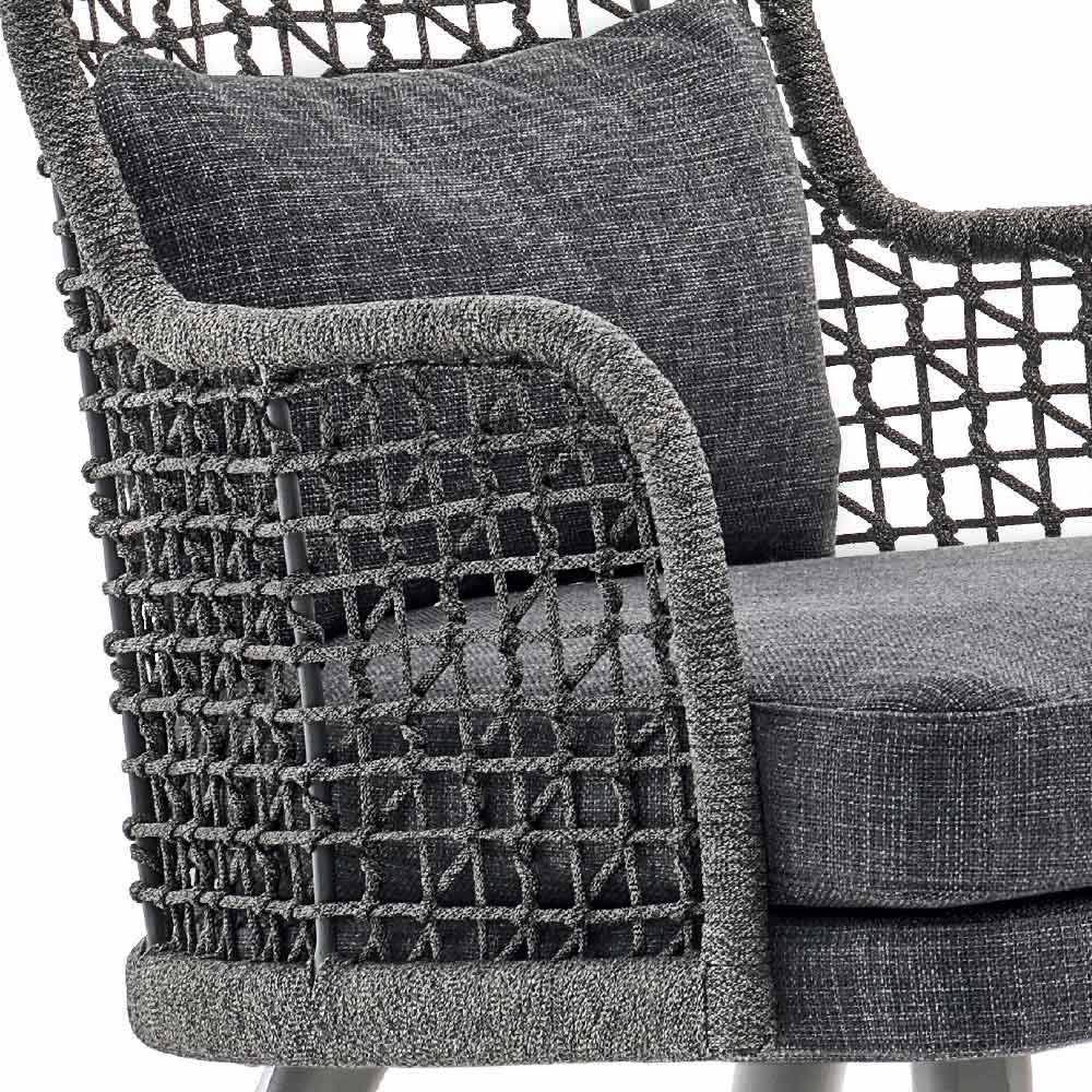 Emma es un magnífico sillón de jardín con una estructura hecha de fibra sintética tejida a mano con un marco de aluminio con recubrimiento de polvo gris oscuro .