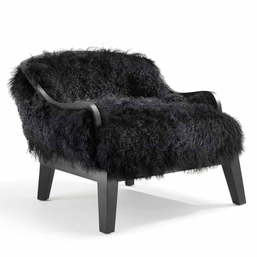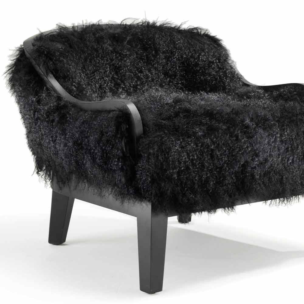 Sillón bajo Retro atrás cubierto de cuero. Asiento y respaldo delanteros cubiertos con pelo negro de cordero tíbet. Marco y base de madera. Terminar en roble negro.