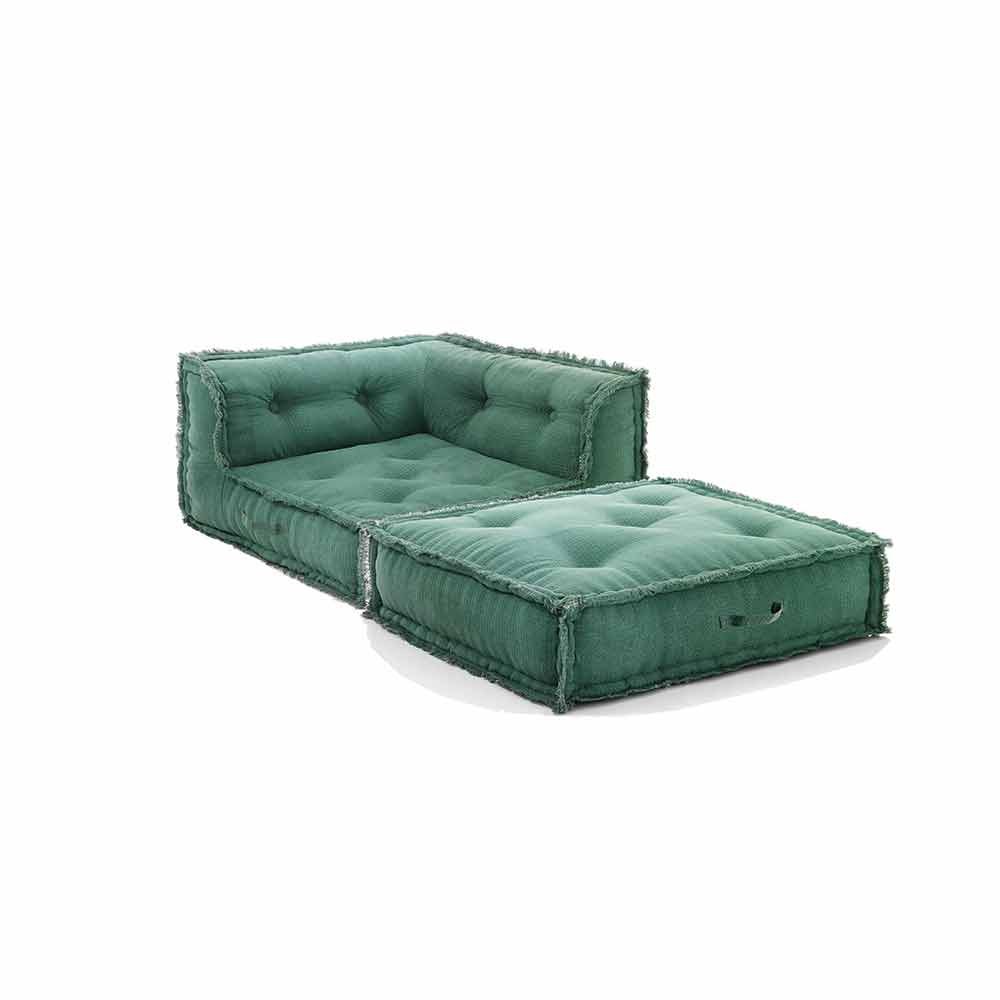 Sillón chaise longue de diseño étnico en esquina, producido en algodón gris, verde o azul.