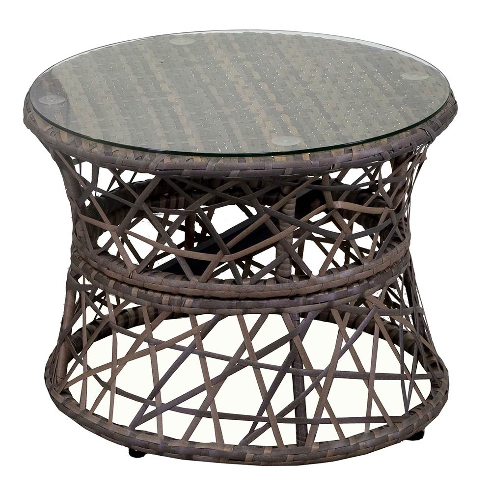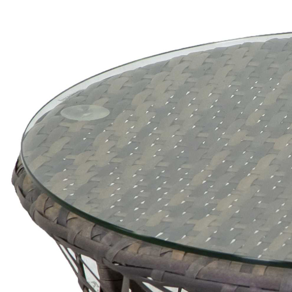 La mesita de café a juego cuenta con un sobre de cristal, ideal para tener a mano bebidas, libros o adornos. Su forma redonda y su tamaño compacto la hacen versátil y fácil de colocar junto al sillón o en cualquier rincón de su jardín o terraza.