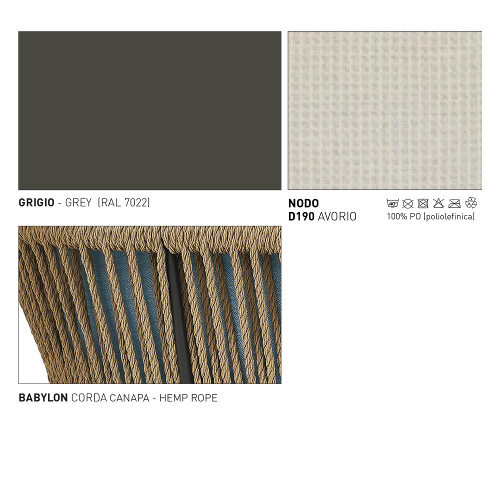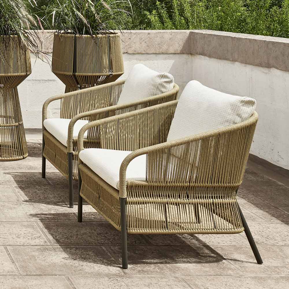 Sillón de exterior con estructura en aluminio pintado en polvo con acabado gris , asiento tejido a mano en cuerda color cáñamo y dos cojines color marfil con acolchado dryfeel incluido. Una solución de decoración innovadora y fresca, enriquecida por los maravillosos acabados propuestos que transforman el ambiente exterior con refinamiento.