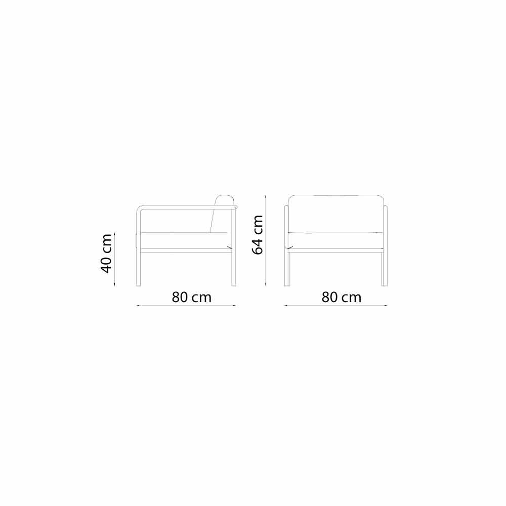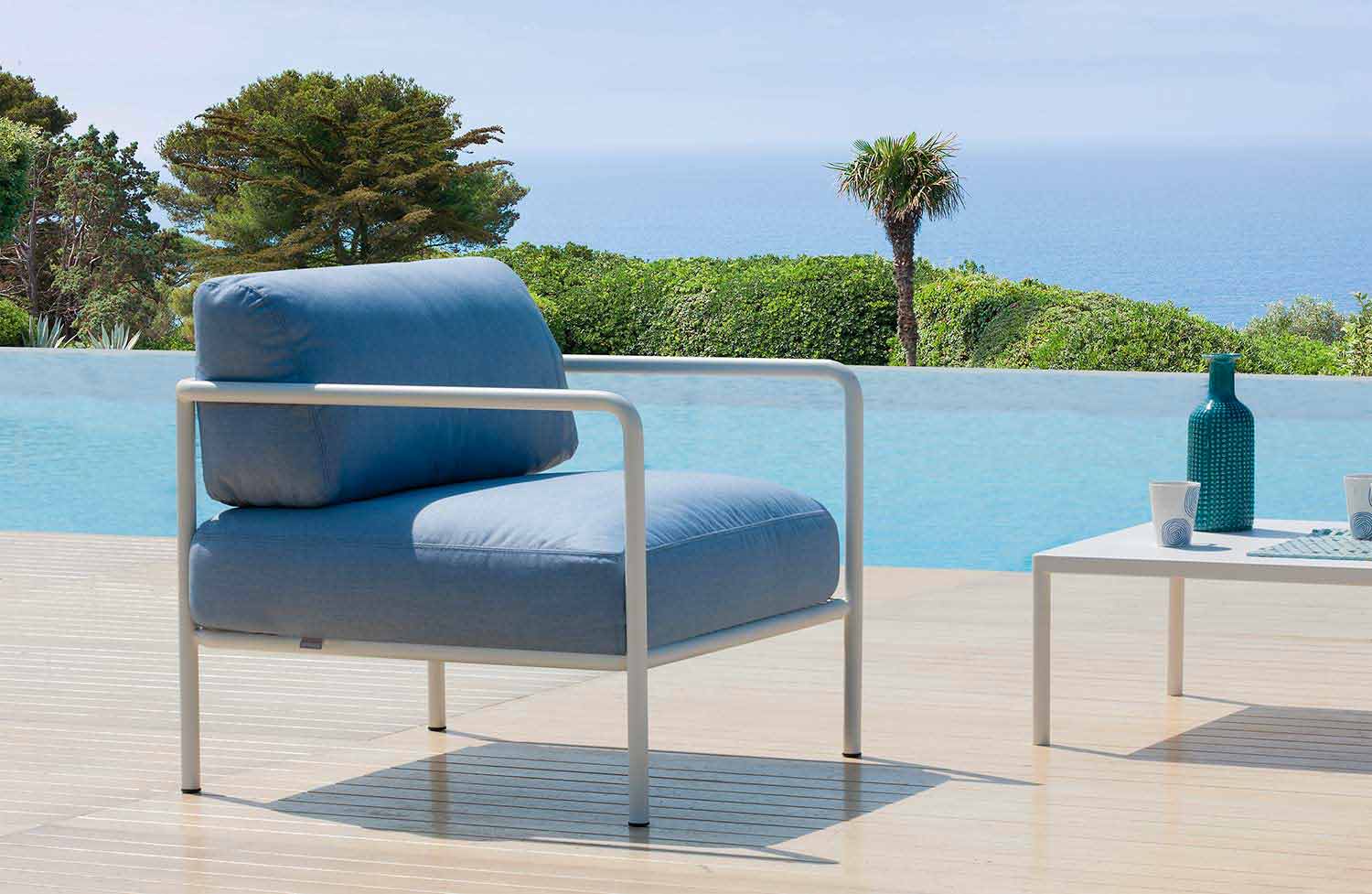 hierro galvanizado con recubrimiento en polvo y pintado con polvos termoendurecibles, mientras que el cojín del asiento y el respaldo son de tela acrílica 100 % teñida. La combinación de estos dos materiales confiere solidez al producto sin descuidar su aspecto visual y decorativo. Ideal para completar la decoración de exteriores que requieren elegancia y personalidad gracias a sus líneas minimalistas que lo convierten en un objeto con un diseño único.