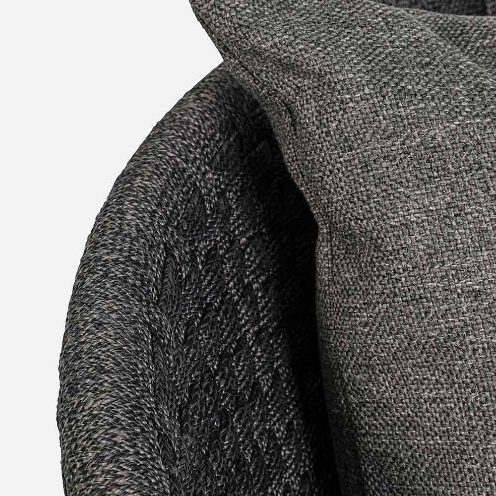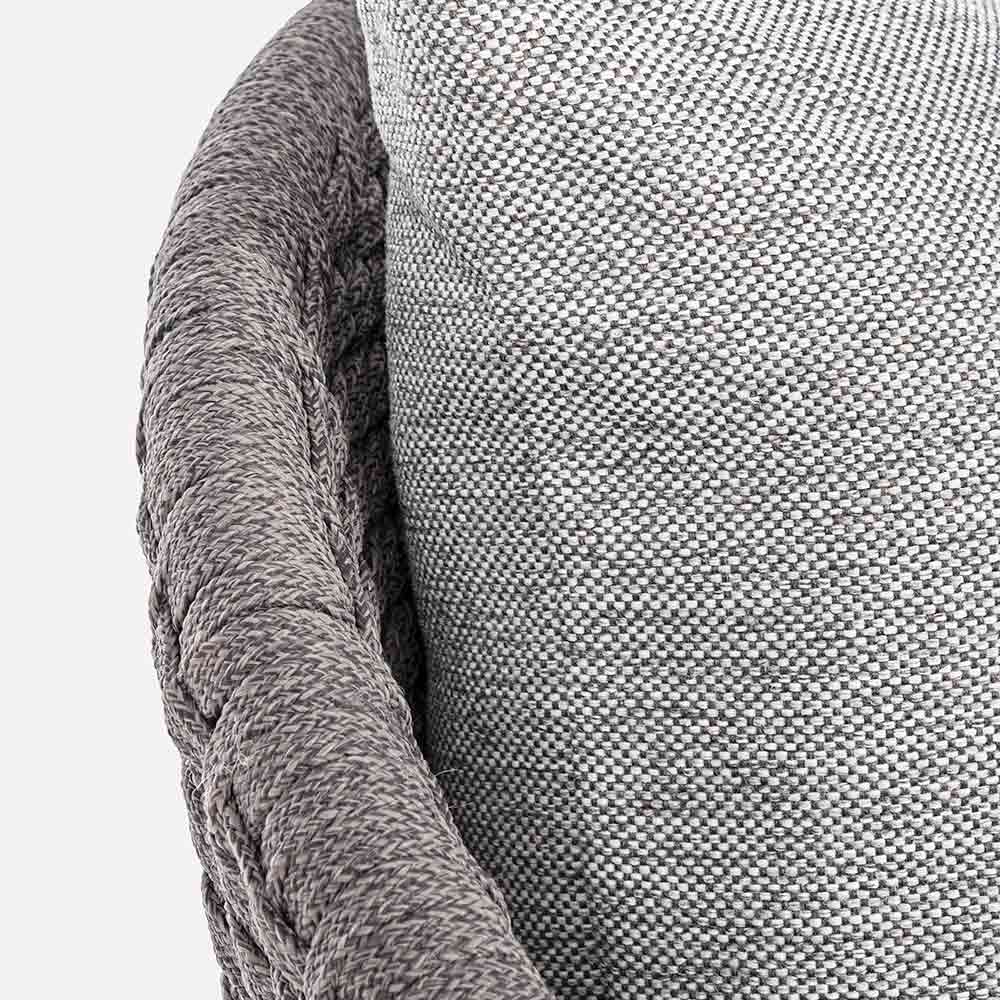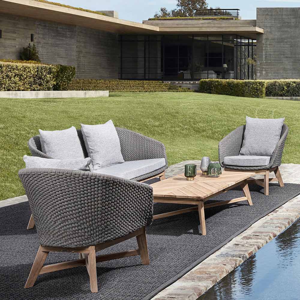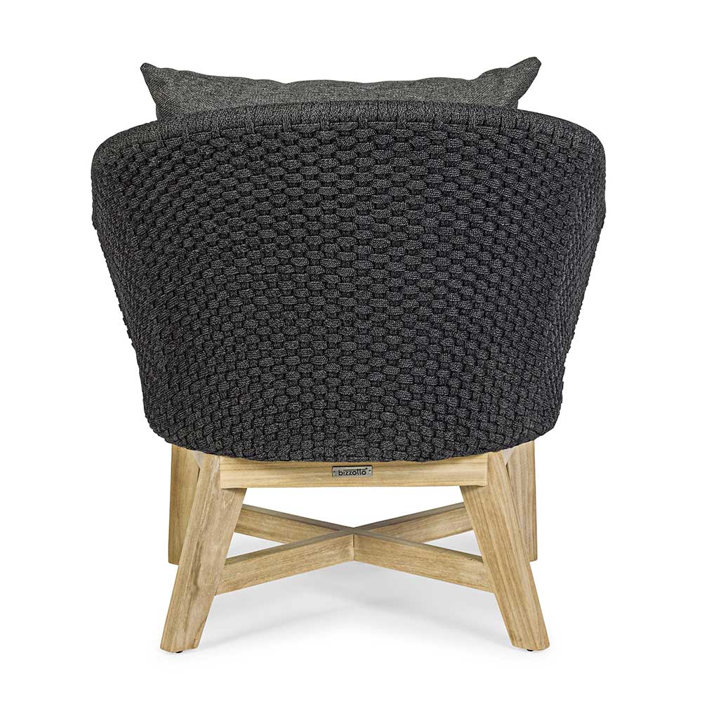Sillón de exterior de lujo en cuerda tejida con cojines de tela extraíbles.