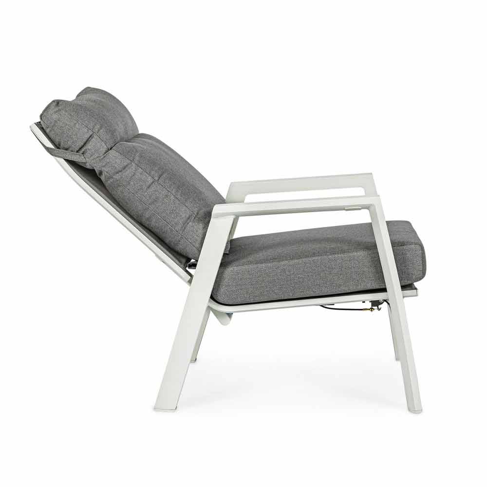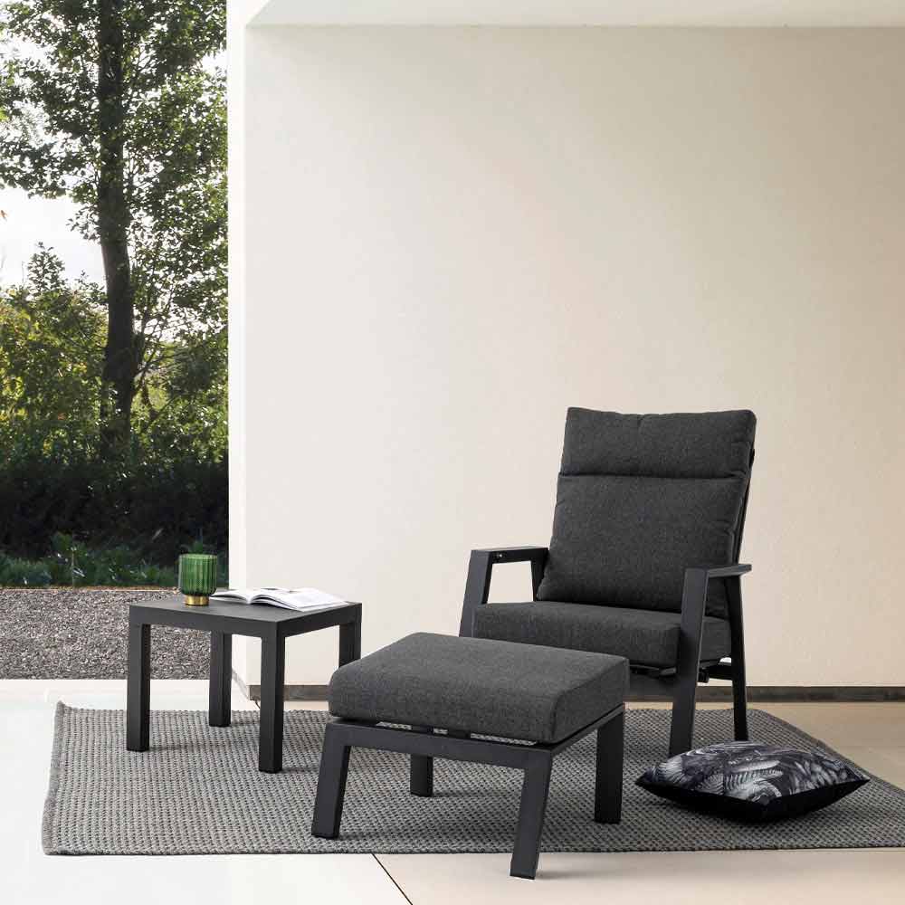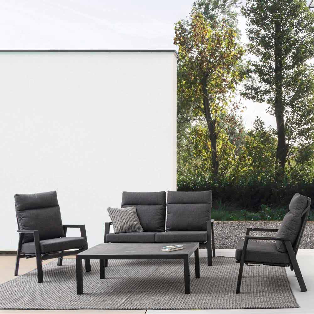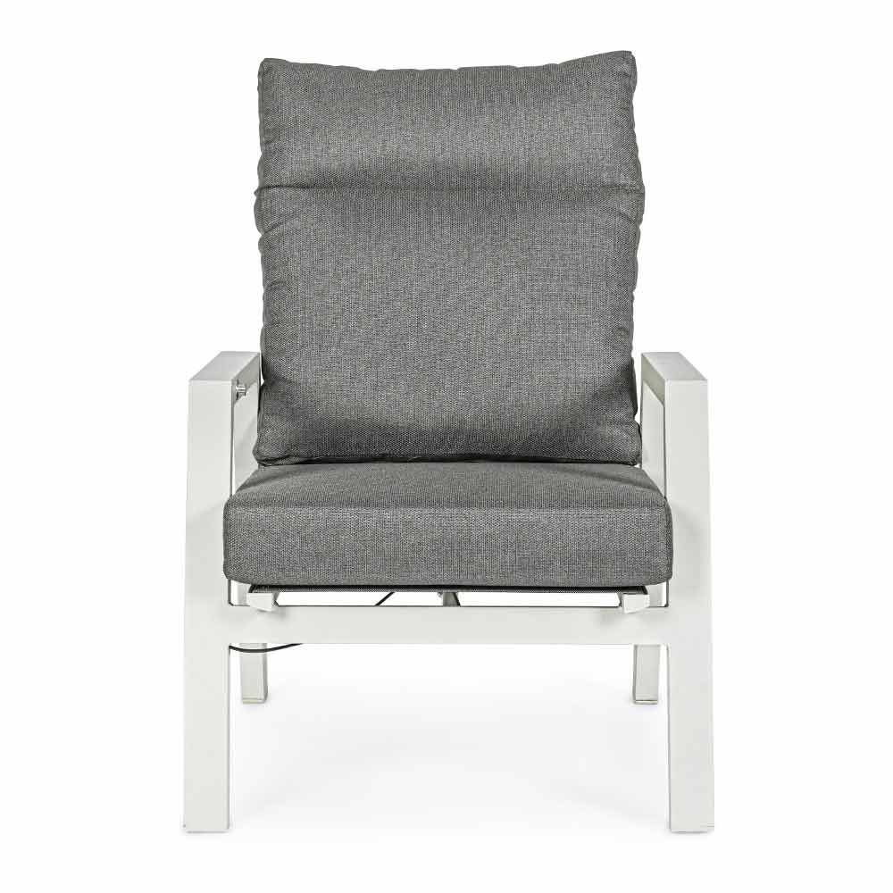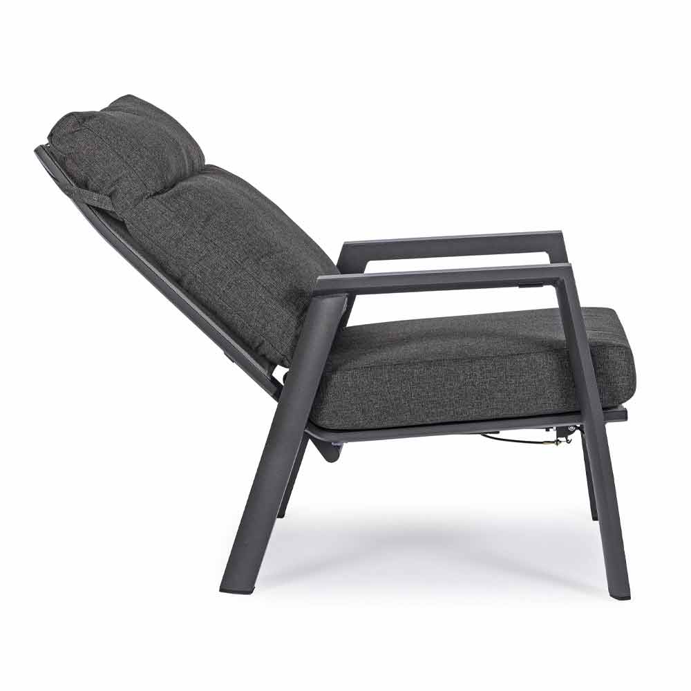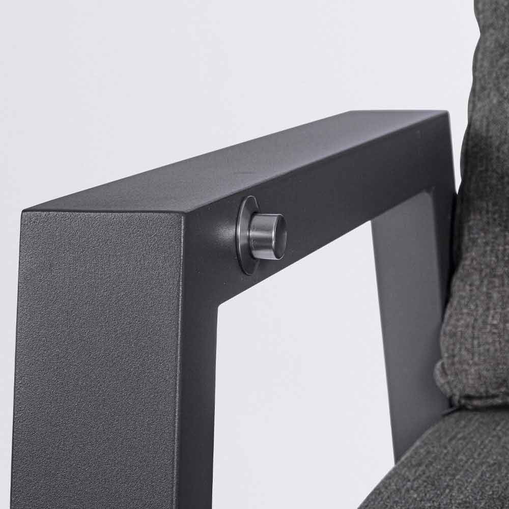 Estructura de aluminio pintado en polvo (poliéster). Respaldo reclinable en posición libre y asiento en textilene 1x1. Cojines desenfundables con tejido de olefina (100% polipropileno).