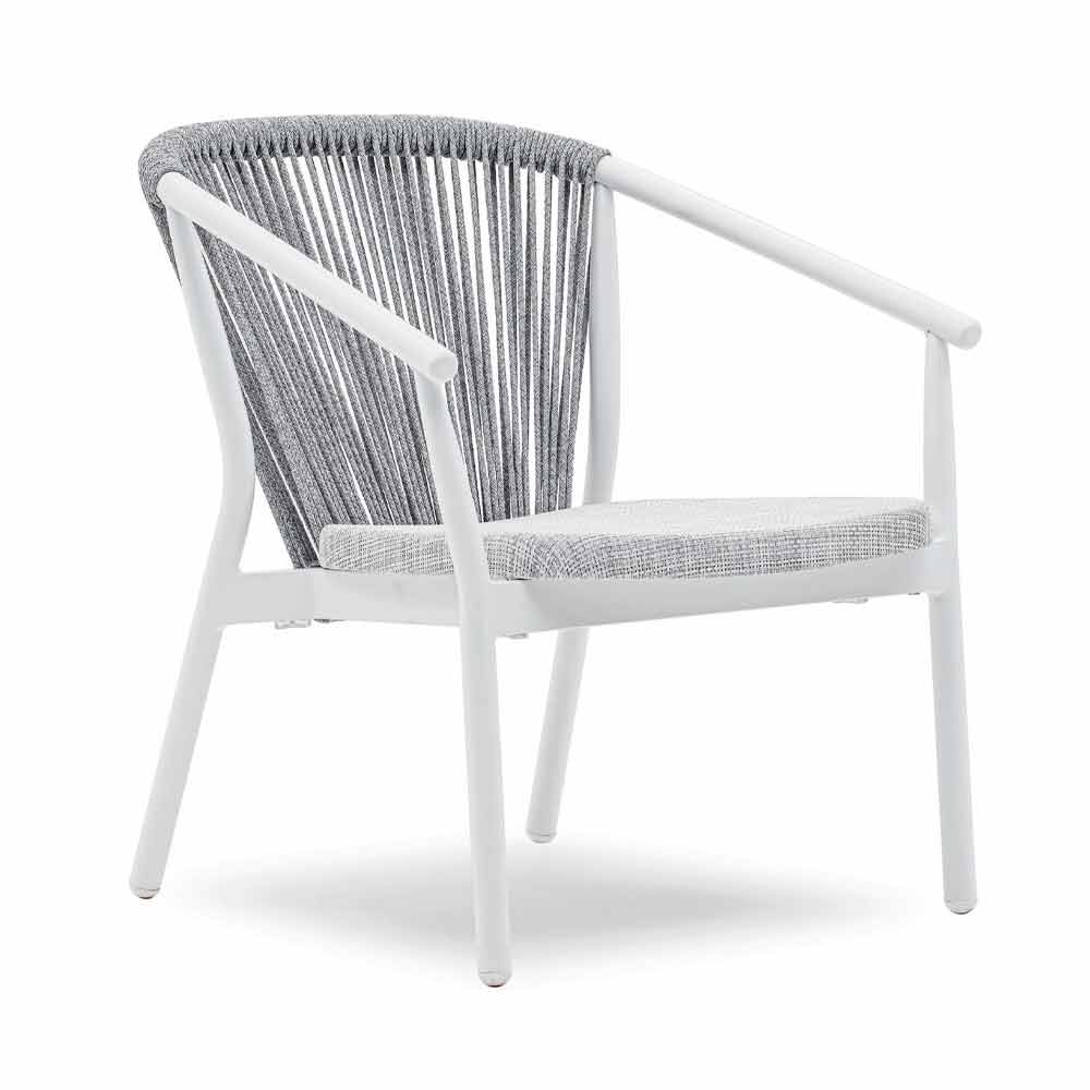 Sillón de diseño moderno para exterior apilable con base de aluminio y asiento en tejido técnico blanco o ceniza.