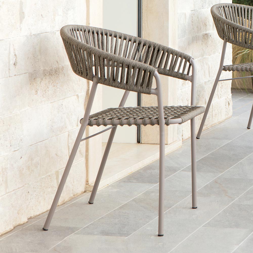 Dos sillones apilables para exterior, fabricados artesanalmente en Italia en acero galvanizado color barro, con asiento y respaldo de cuerda color barro . El galvanizado proporciona una mayor resistencia del acabado del material a agentes atmosféricos corrosivos como la sal y la acidez de la lluvia, mientras que las cuerdas son resistentes al cloro, a los rayos solares y al moho.