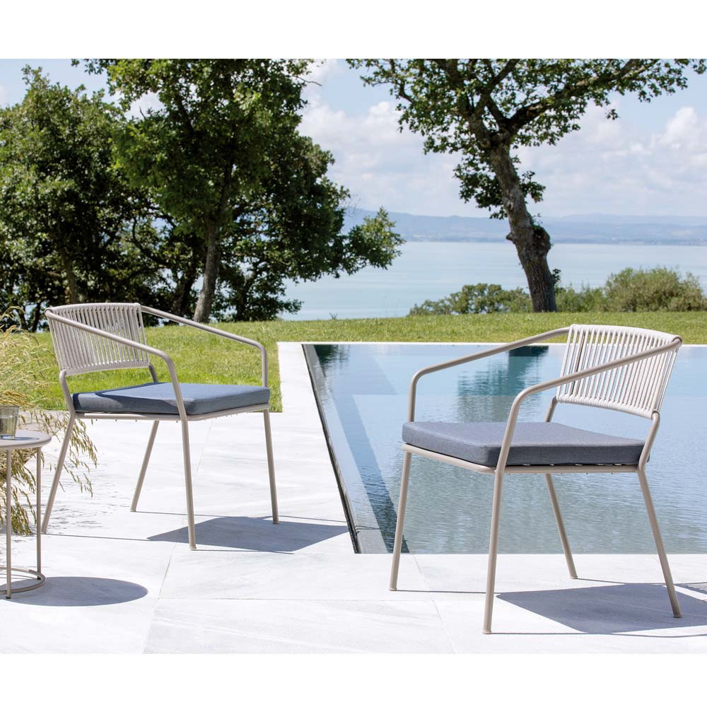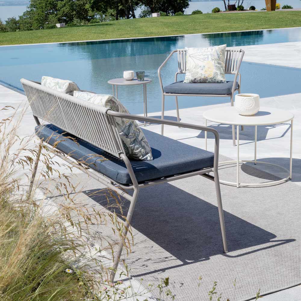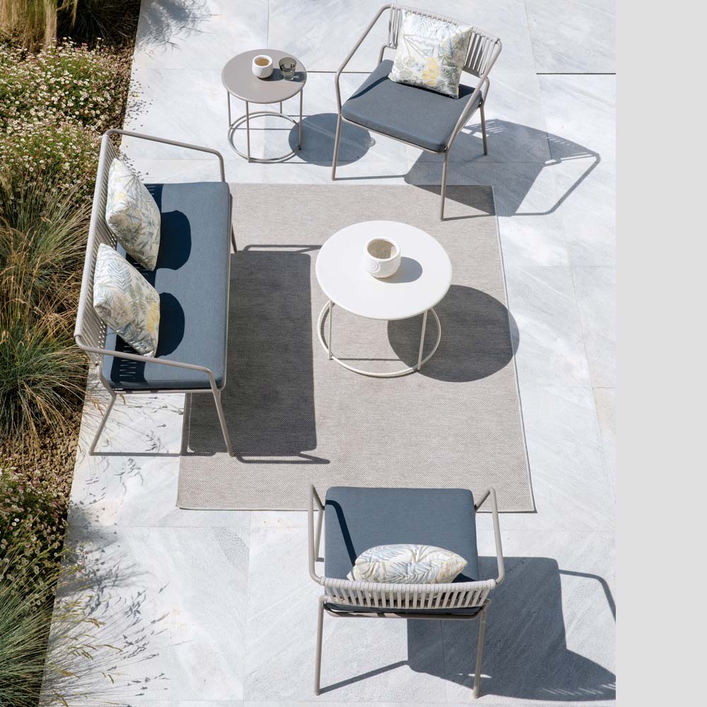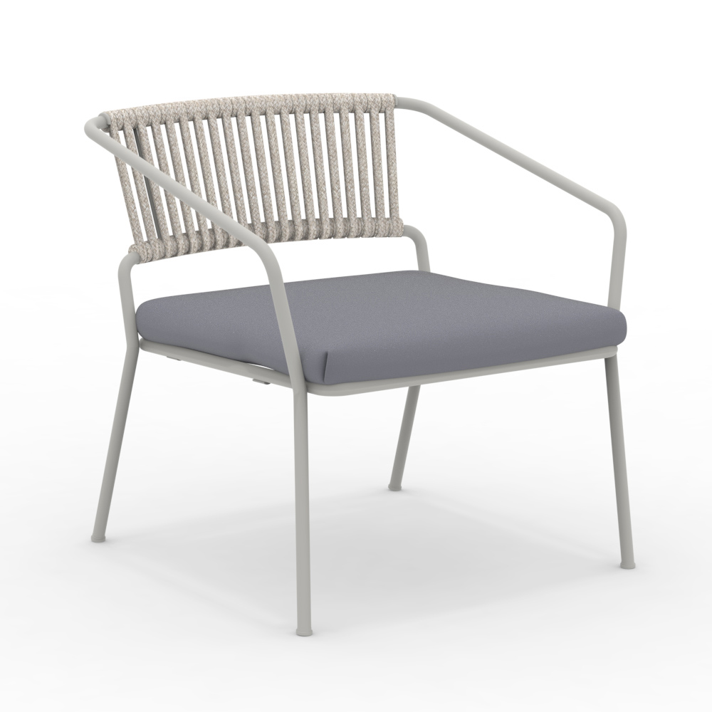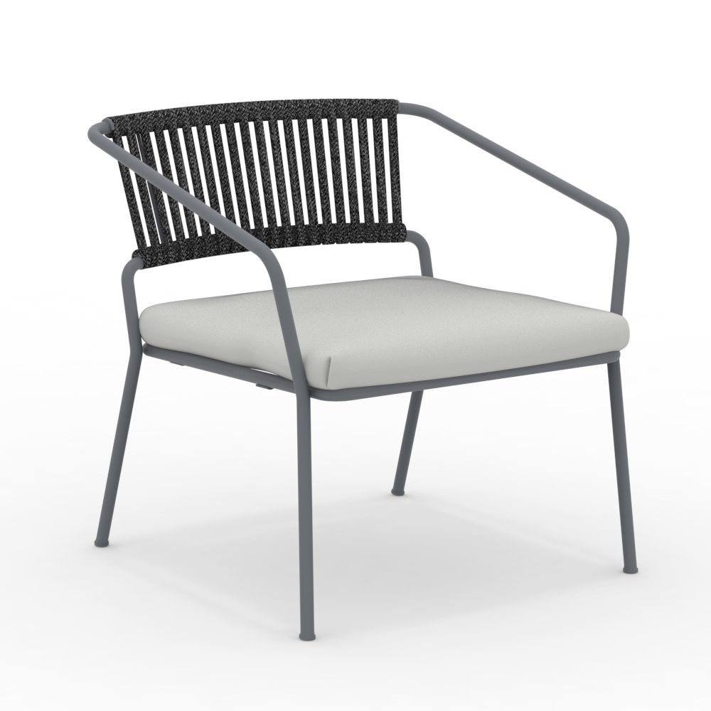 Sillón bajo de jardín con estructura de hierro galvanizado con recubrimiento en polvo y asiento de cuerda y tela. Fabricado en Italia.