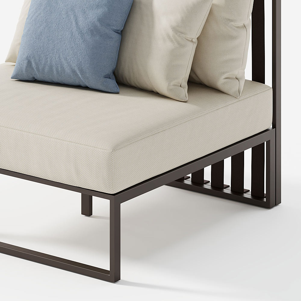 Sillón de jardín con estructura central de aluminio pintado con polvo epoxi (con características antigolpes y antiarañazos) y cinturones de poliéster con asiento y respaldo en cojines tapizados en tejido Irisun® Living Solids íntegramente Made in Italy . La característica que hace único a este producto es la alternancia de llenos y vacíos que aligera la estructura haciéndola flotar en el espacio. Este conjunto de mobiliario es perfecto para dar a la estancia un toque único y sofisticado y, gracias a los materiales utilizados, la calidad y la resistencia en el tiempo están garantizadas. La comodidad del asiento permite crear un ambiente acogedor e informal apto para todas las ocasiones.