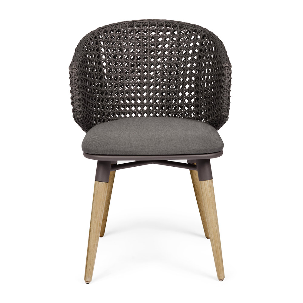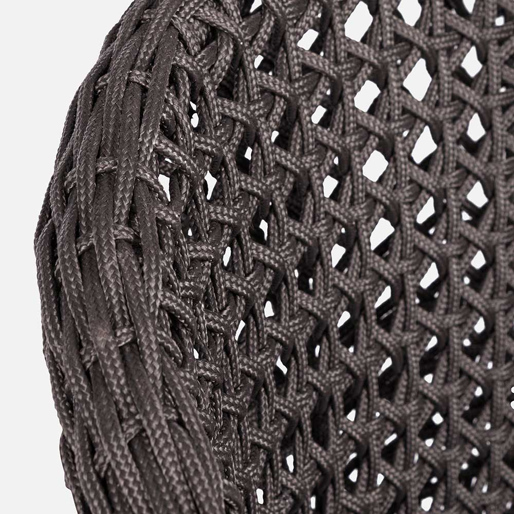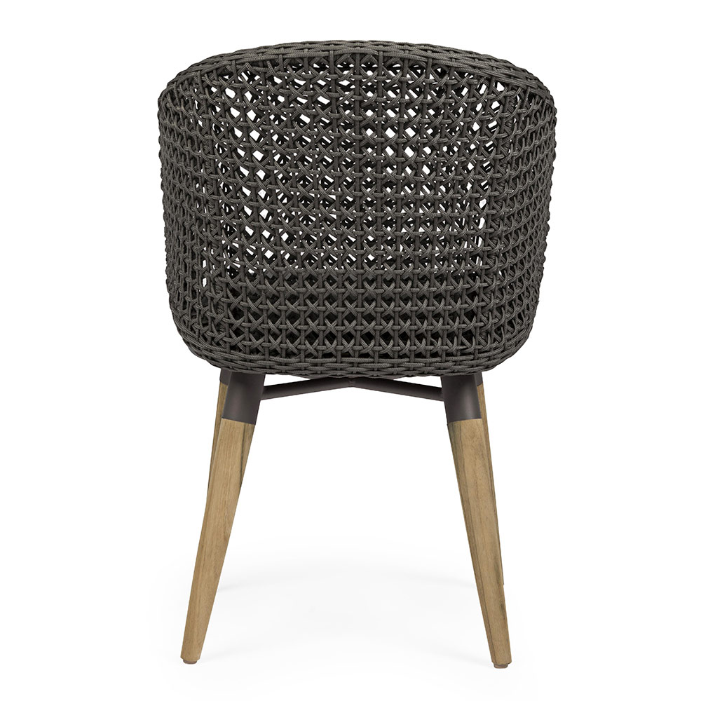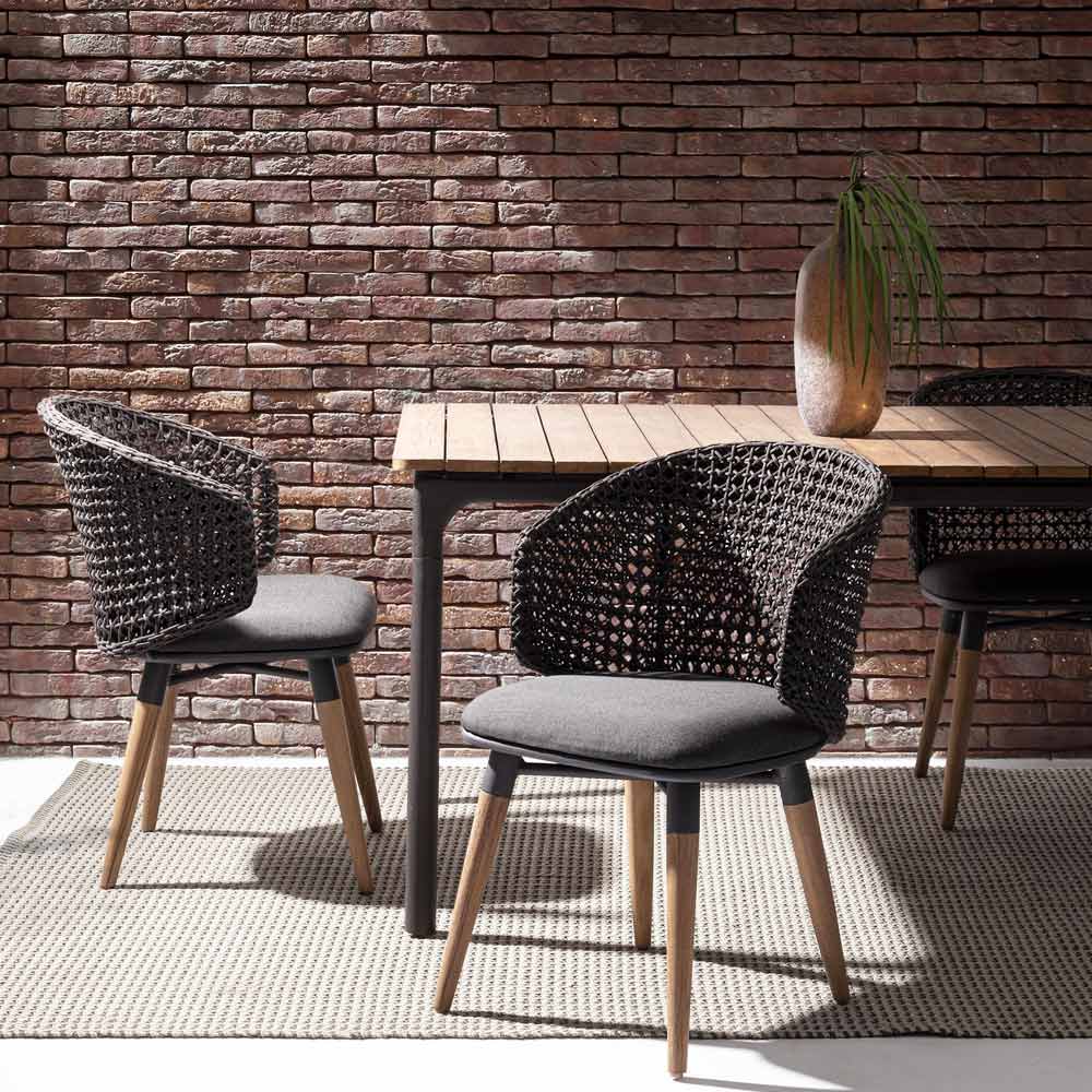 Sillón de exterior de alta calidad en cuerda y tela con patas de madera de teca.
