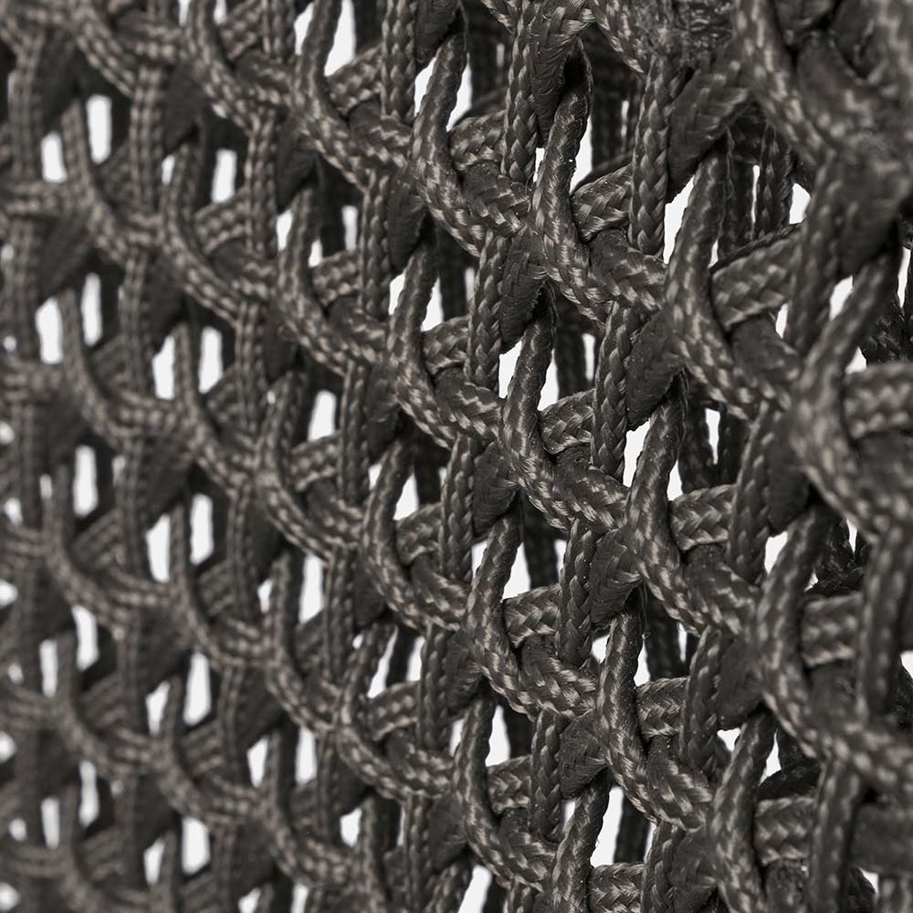 Estructura de aluminio con recubrimiento de polvo (poliéster) (fundición). Patas de teca - SVLK (madera certificada procedente de bosques sostenibles) con acabado rústico. Tejido para uso exterior en cuerda (polipropileno), repelente al agua y resistente a los rayos UV.