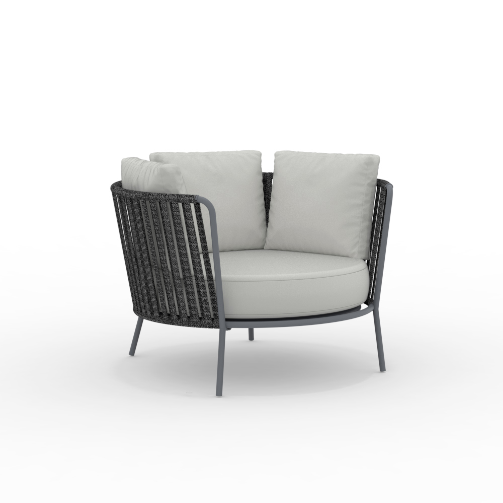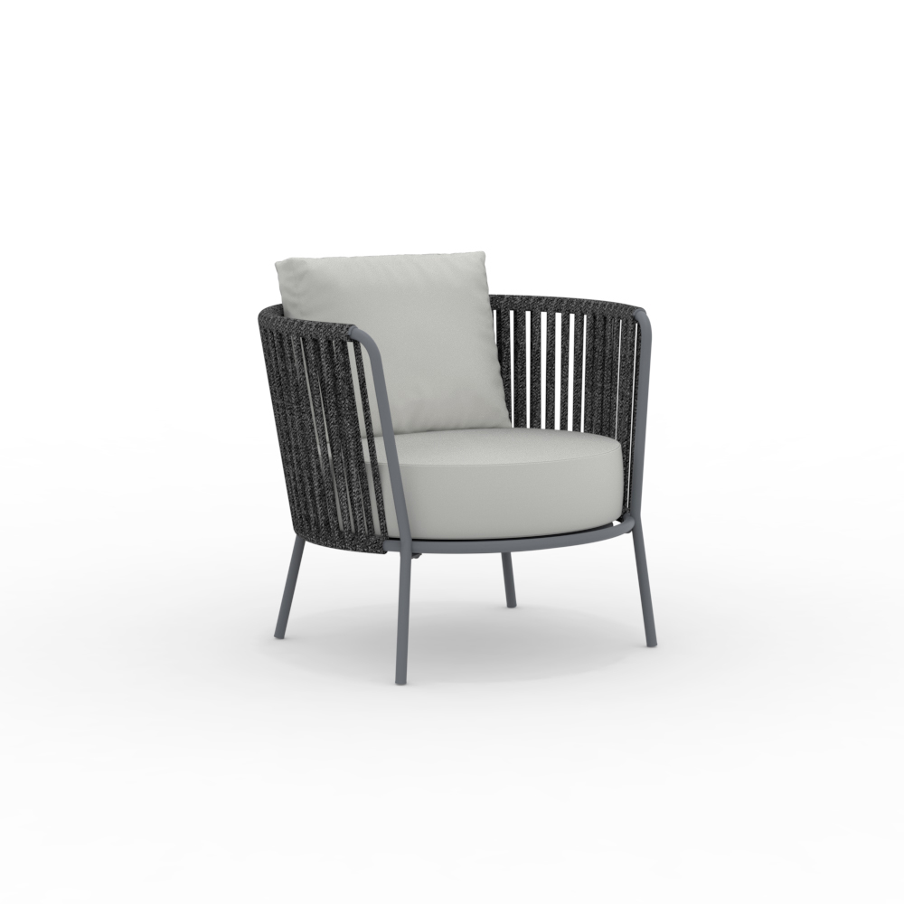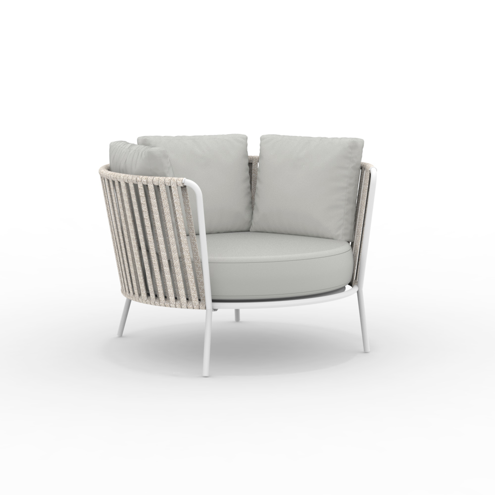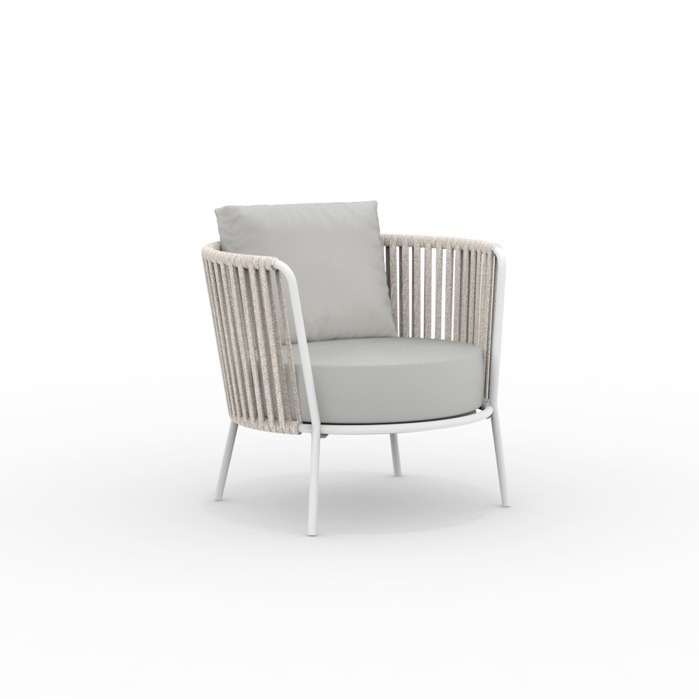 La estructura de acero inoxidable garantiza solidez y resistencia a los agentes atmosféricos, mientras que el tejido de cuerda aporta ligereza y refinamiento, envolviendo el asiento en un cómodo abrazo. El diseño ergonómico y las líneas redondeadas garantizan una experiencia de asiento agradable y relajante.