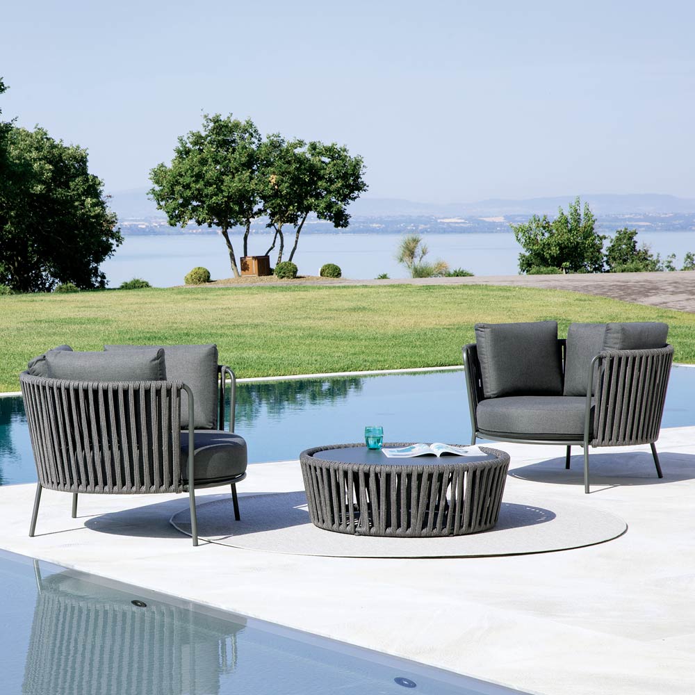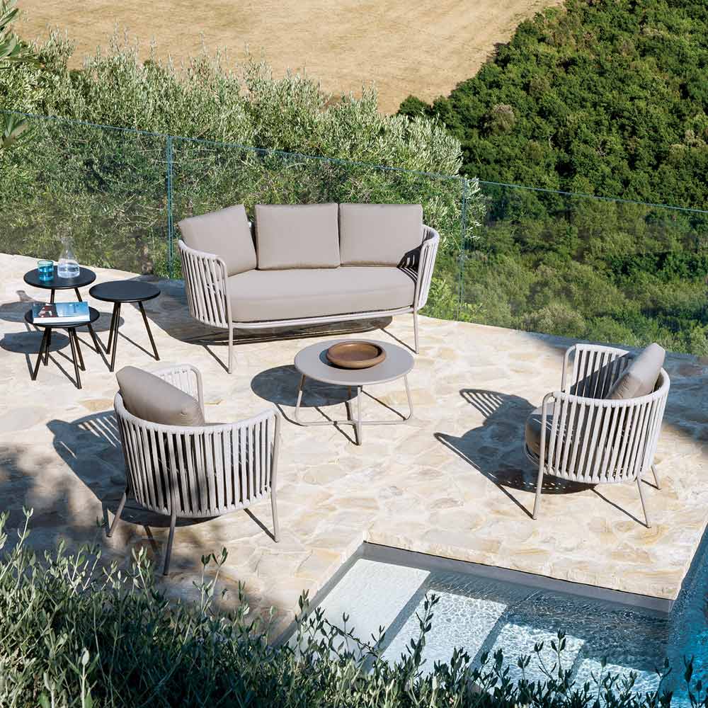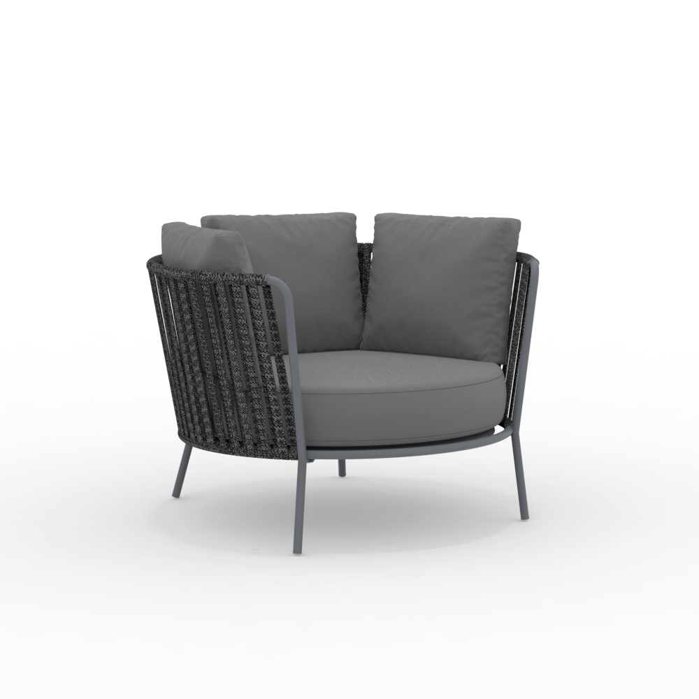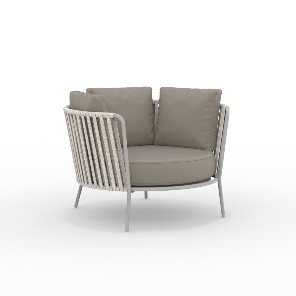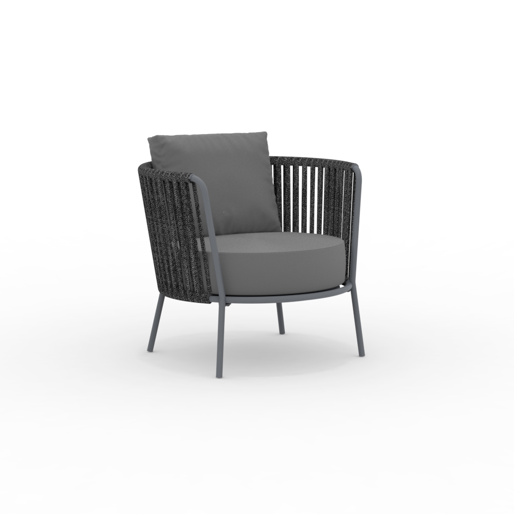 La estructura de acero inoxidable garantiza solidez y resistencia a los agentes atmosféricos, mientras que el tejido de cuerda aporta ligereza y refinamiento, envolviendo el asiento en un cómodo abrazo. El diseño ergonómico y las líneas redondeadas garantizan una experiencia de asiento agradable y relajante.