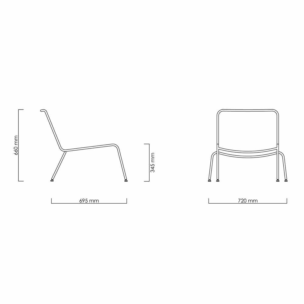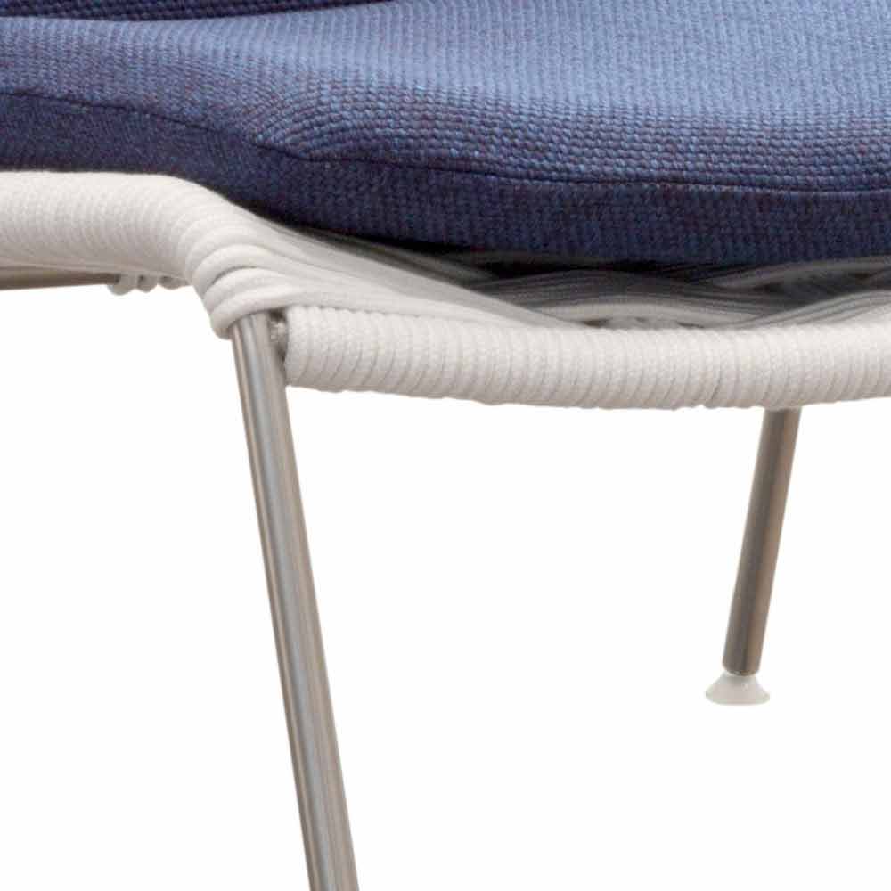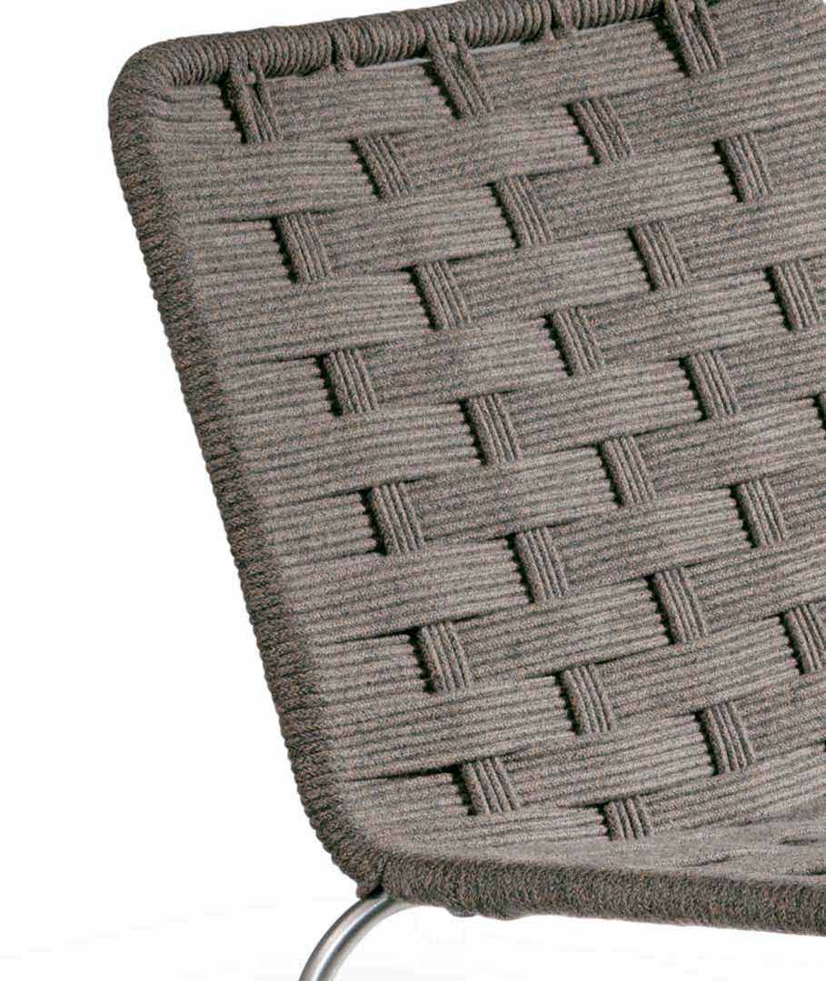 Es un pequeño sillón con estructura de acero inoxidable satinado. Asiento y respaldo tejido en cordón acrílico con posibilidad de elegir entre colores: