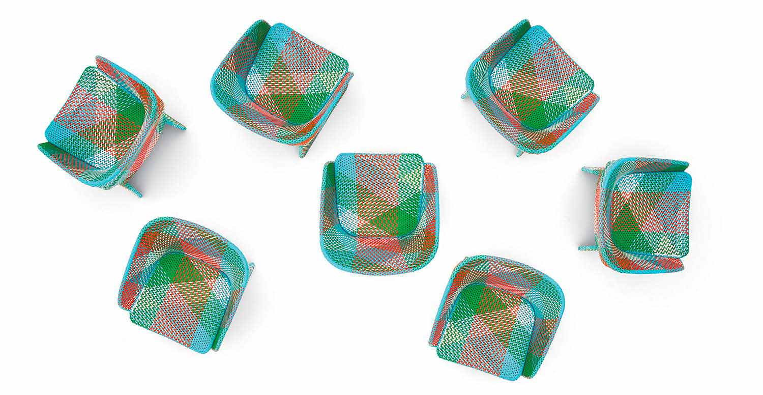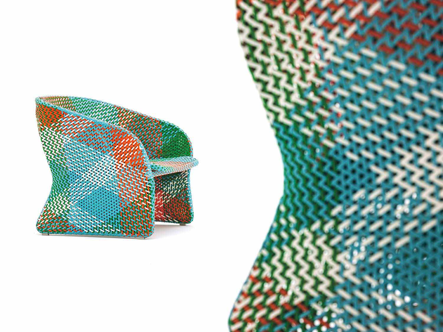 Cuatro cintas de fibra sintética de diferentes colores se cruzan para dar forma al tejido del sillón Maat. El tejido se realiza a mano alrededor de una estructura de aluminio con recubrimiento en polvo.