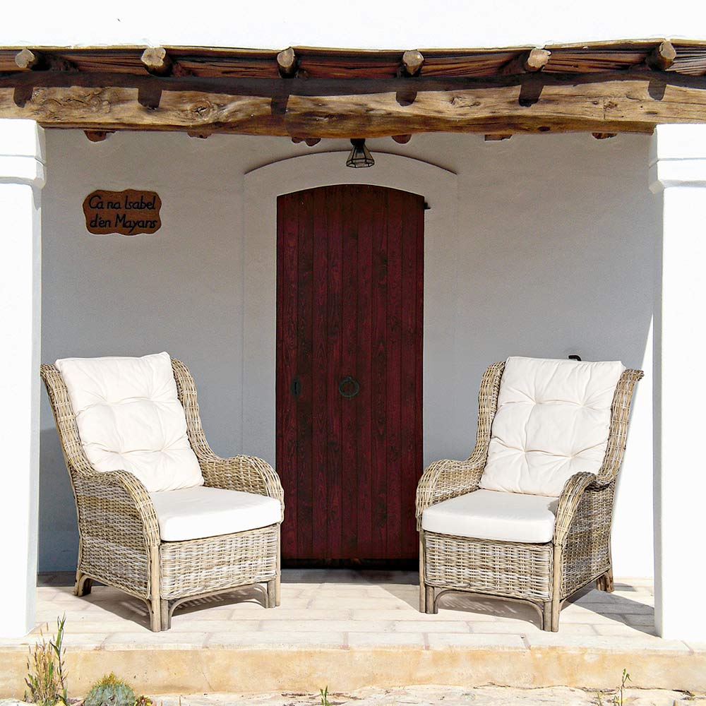 Sillón de jardín de ratán natural para uso exterior, equipado con cojines.