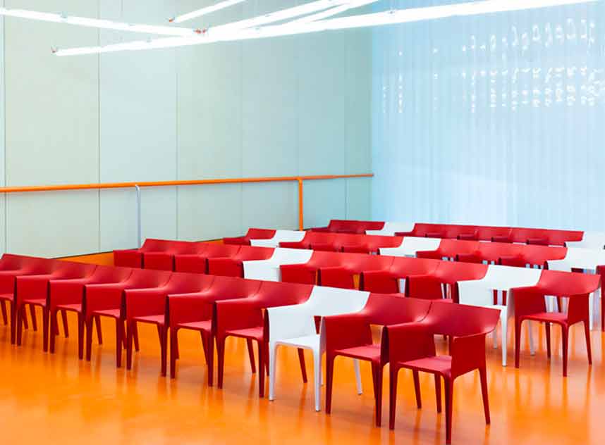 La línea quiere jugar con las olas y formar parte de un movimiento en progreso: el de una onda ondulada que imita el movimiento del mar. El sillón tiene una forma y un diseño apilables para reducir el espacio. Disponible en los siguientes colores: blanco, negro, ecrù, rojo, pistacho y mostaza.