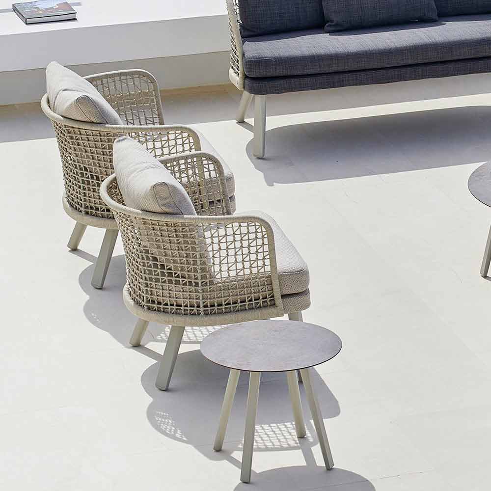 Emma es un magnífico sillón de jardín caracterizado por una estructura de fibra sintética tejida a mano con un marco de aluminio con recubrimiento de polvo beige .