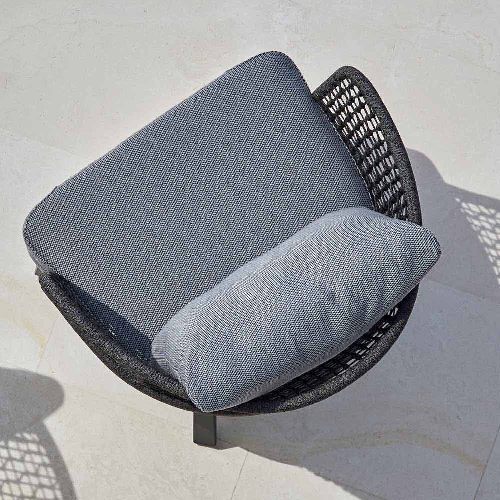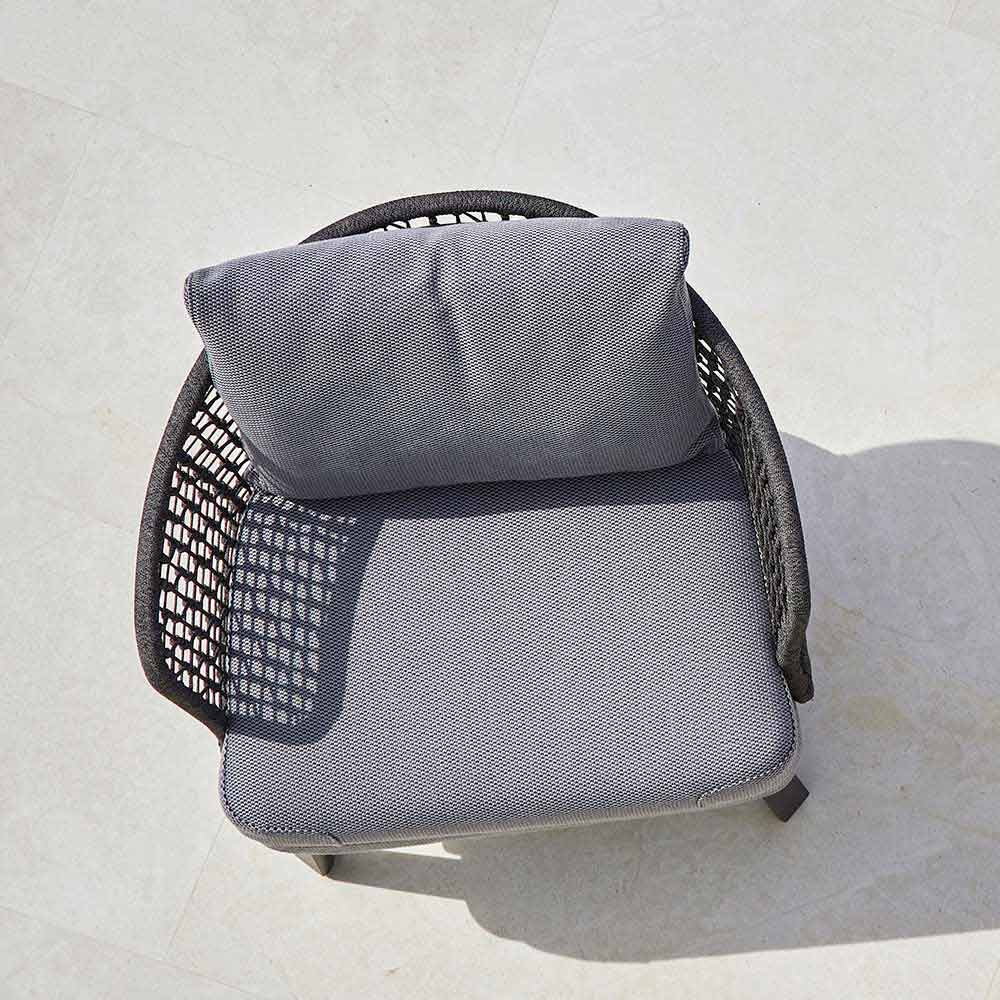Emma es un espléndido sillón para exteriores con una estructura de fibra sintética tejida a mano con un marco de aluminio con recubrimiento de polvo gris oscuro .