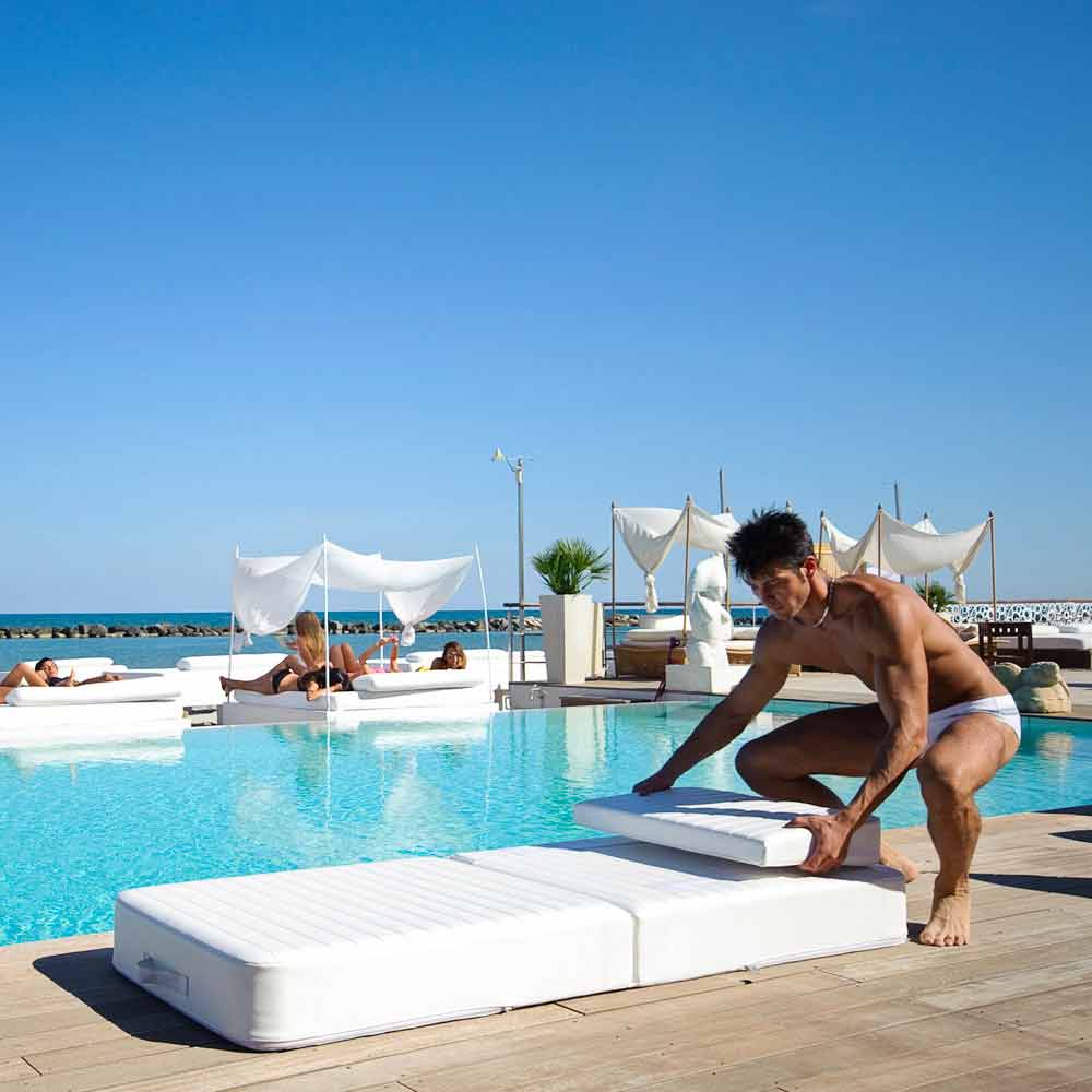 - Puede funcionar como un elemento decorativo elegante fuera del agua ya que se puede convertir en una tumbona.